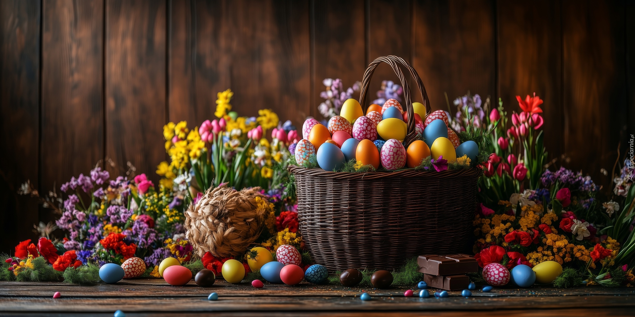Edytor tapety: Kosz pełen kolorowych pisanek wśród kwiatów