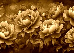 Edytor tapety: Rozwinięte różowe piwonie z listkami w malarstwie