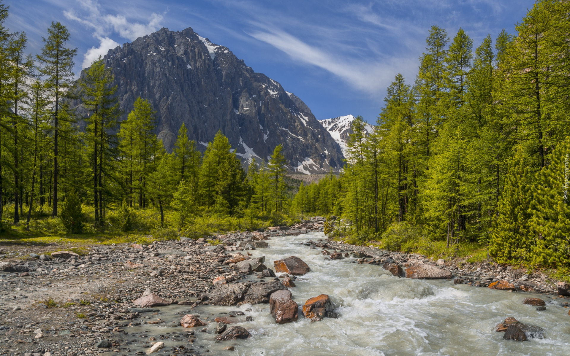 Edytor tapety: Drzewa nad kamienistą rzeką z górami w tle
