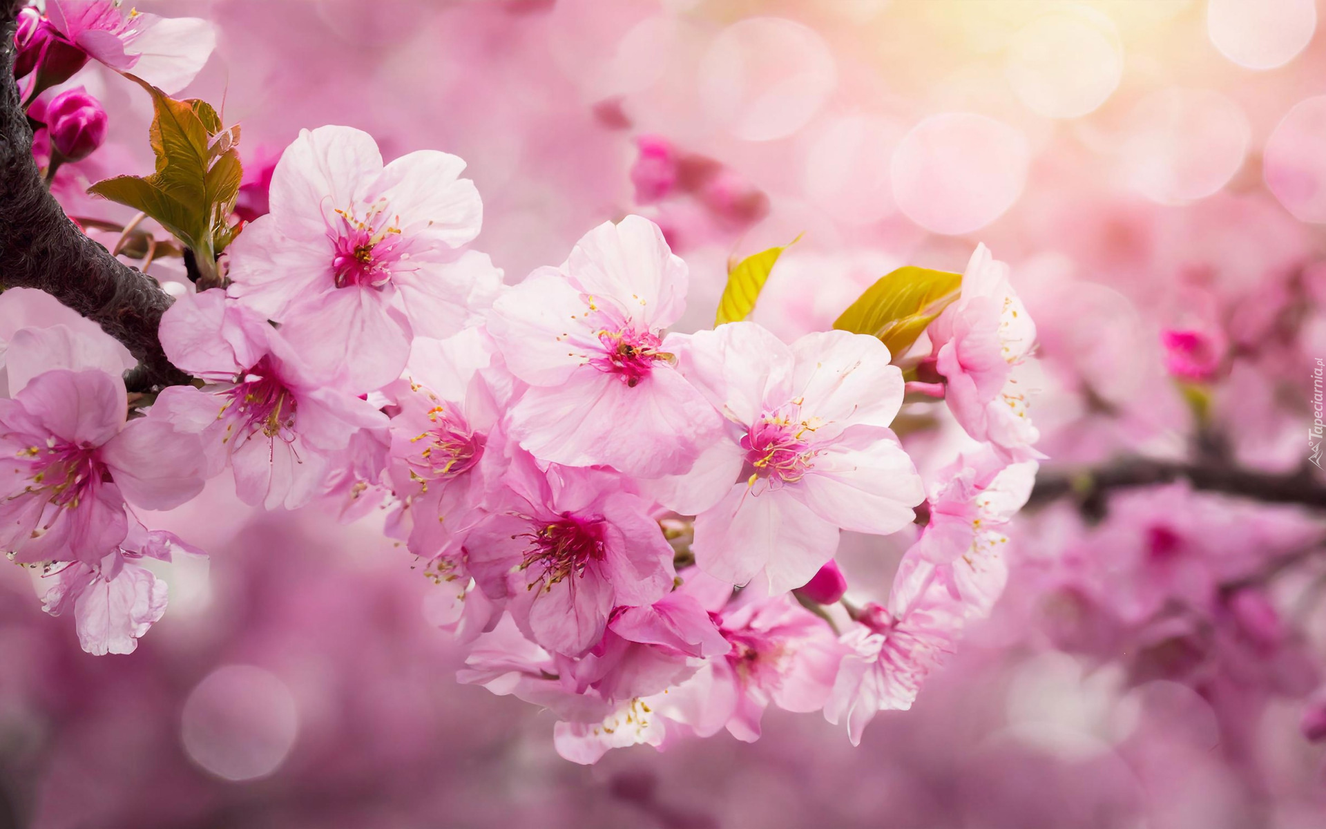 Edytor tapety: Gałązka drzewa owocowego z jasnoróżowymi kwiatami