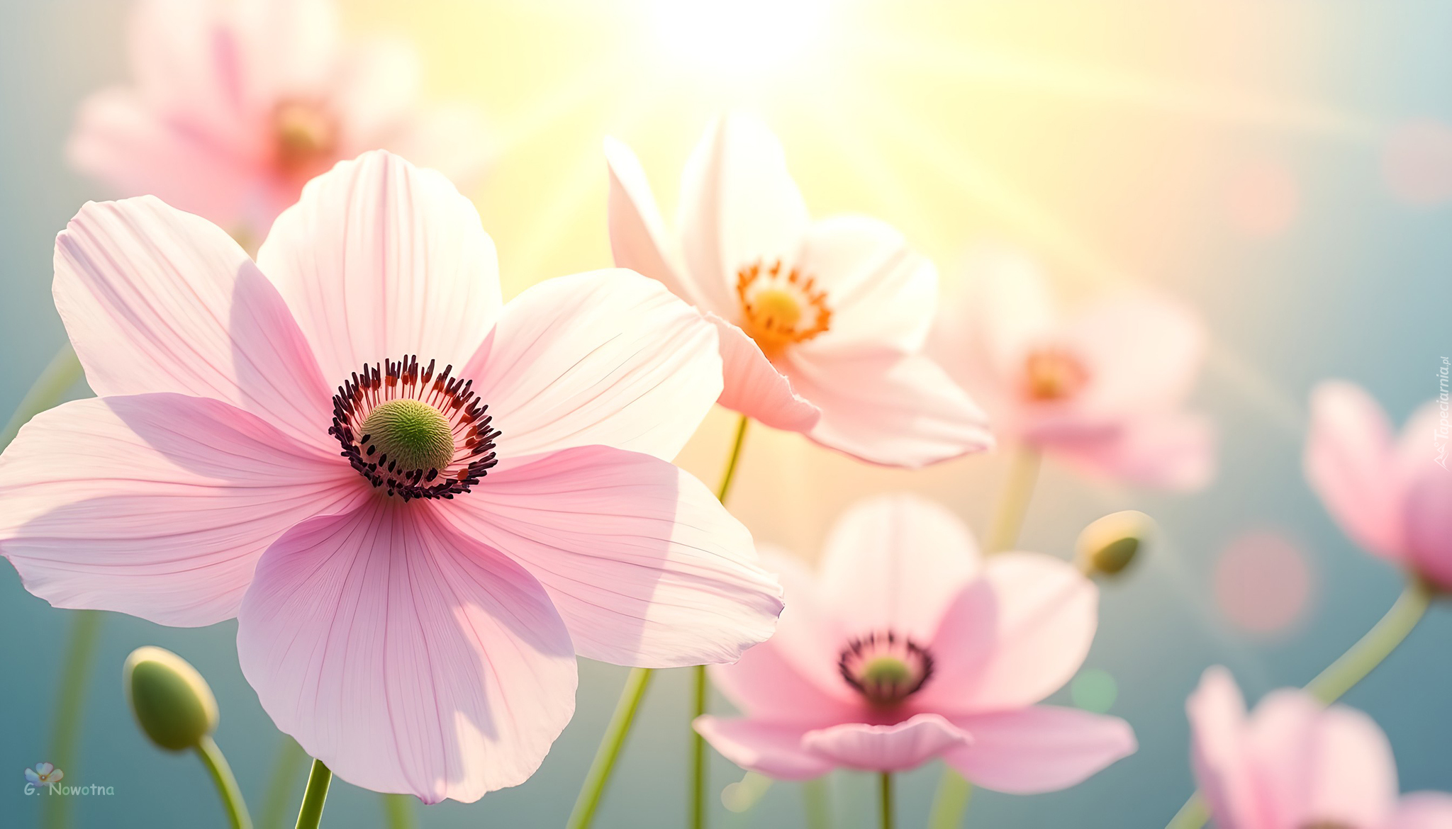 Edytor tapety: Rozświetlone słońcem jasnoróżowe kwiaty w zbliżeniu