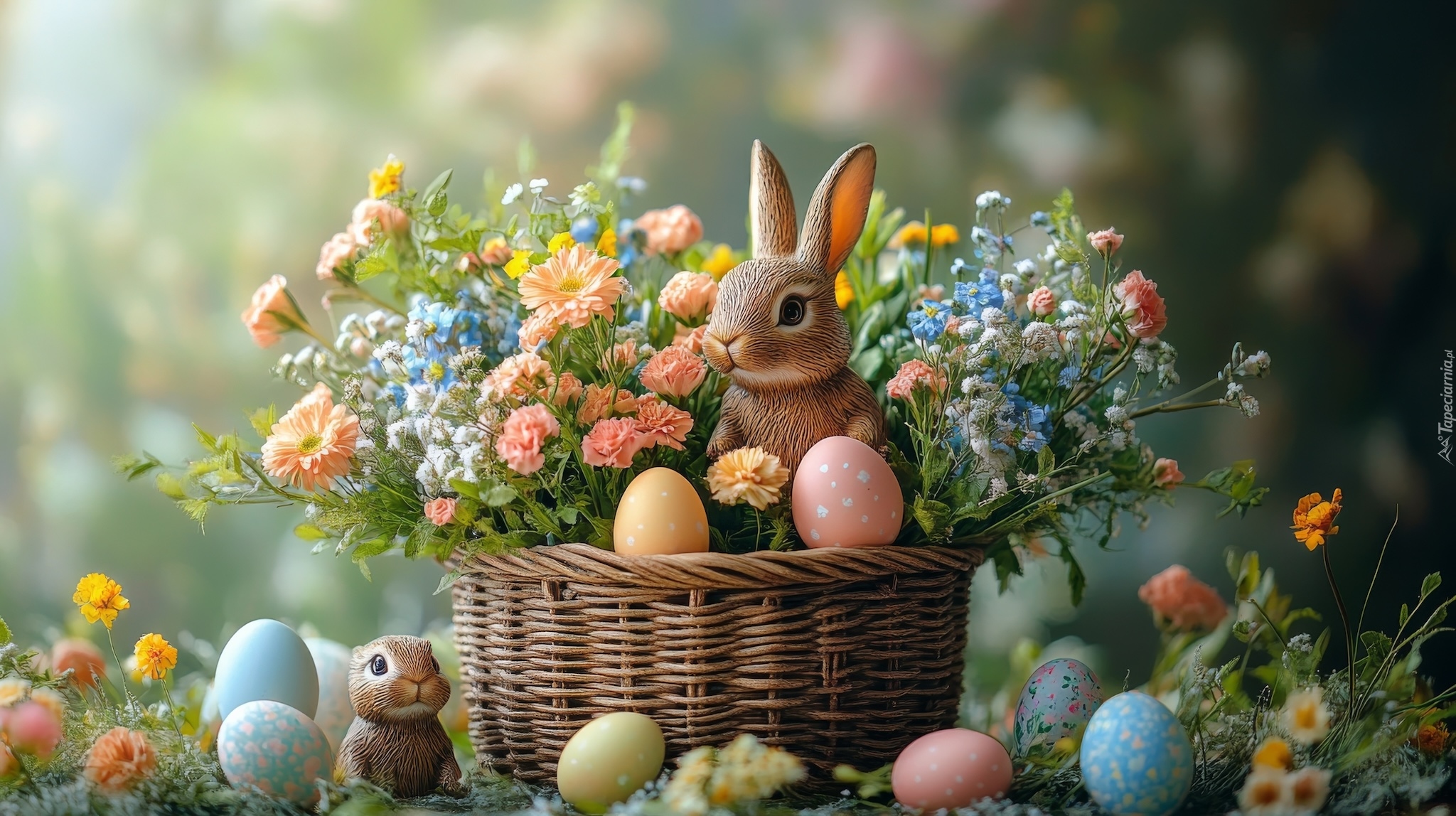 Edytor tapety: Zajączek i pisanki w koszyku pełnym kwiatów