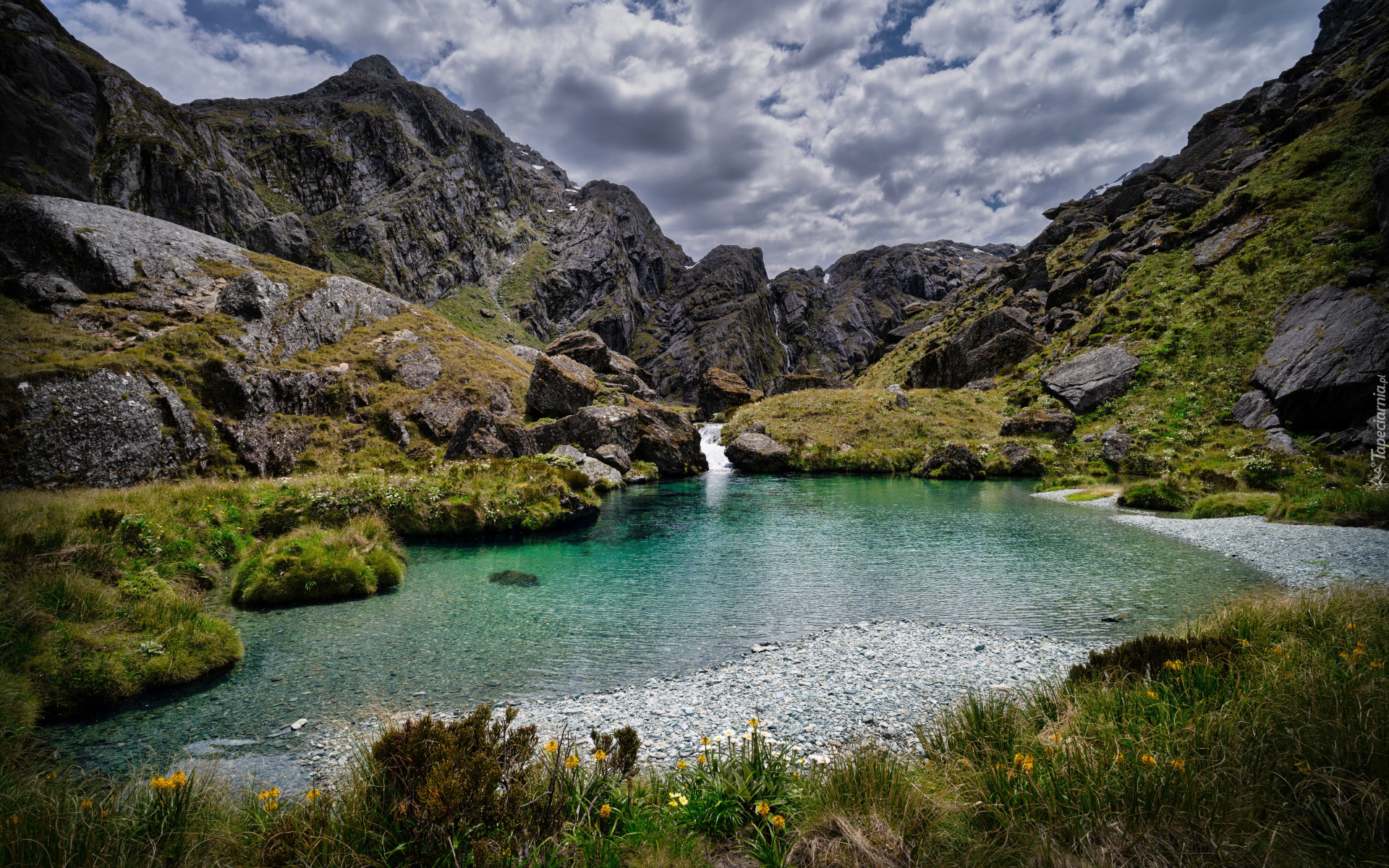 Edytor tapety: Drzewa i trawa nad górskim jeziorem pod chmurami