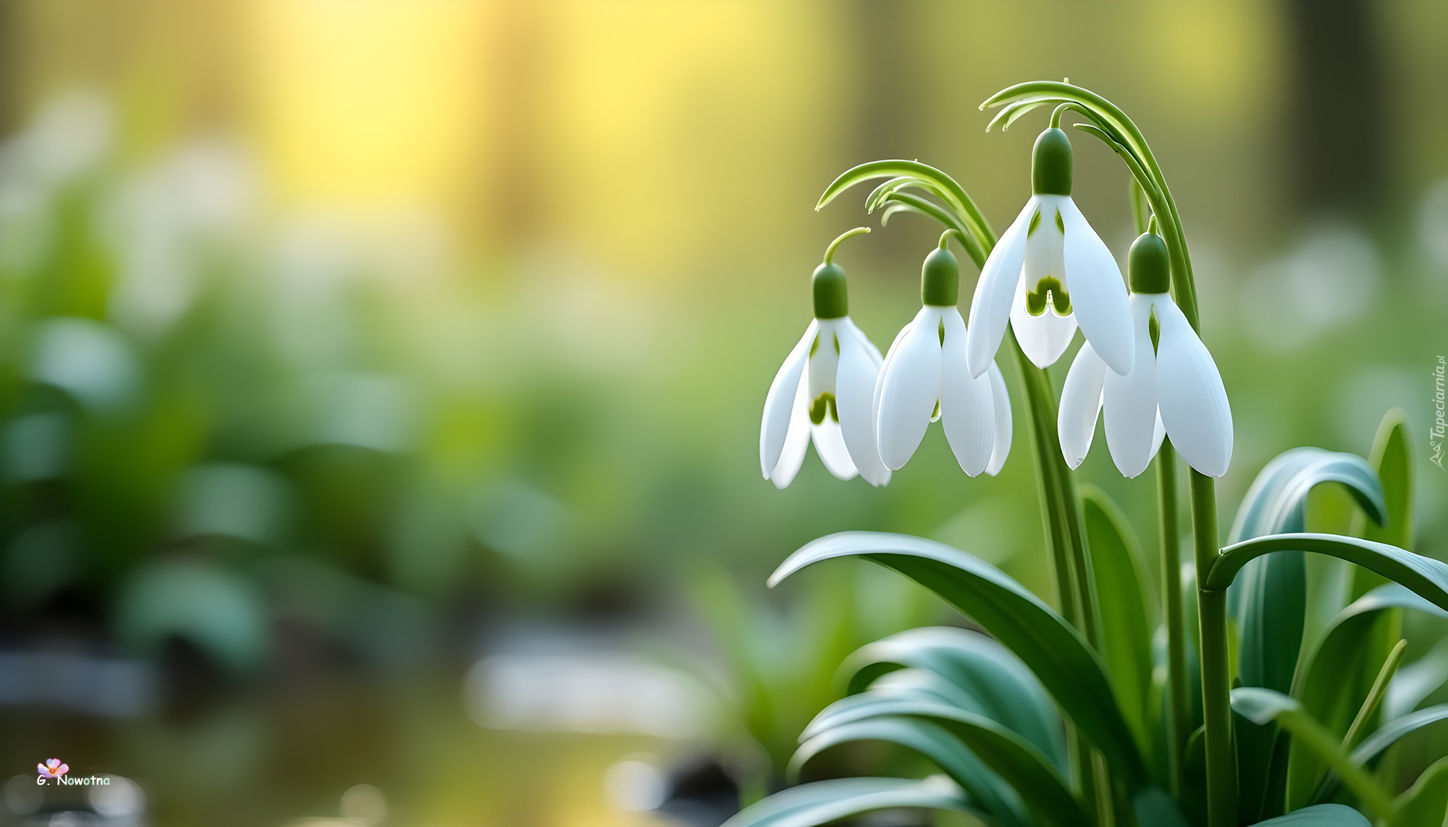 Edytor tapety: Kępka białych przebiśniegów z listkami