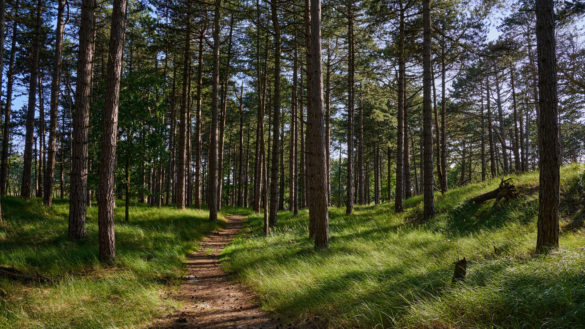 Edytor tapety: Rozświetlona światłem ścieżka w lesie iglastym