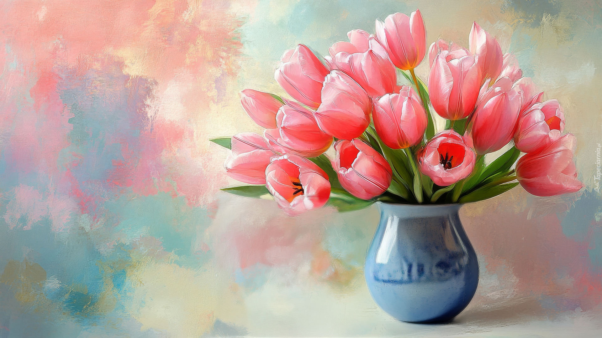 Edytor tapety: Rozświetlone różowe tulipany w wazonie