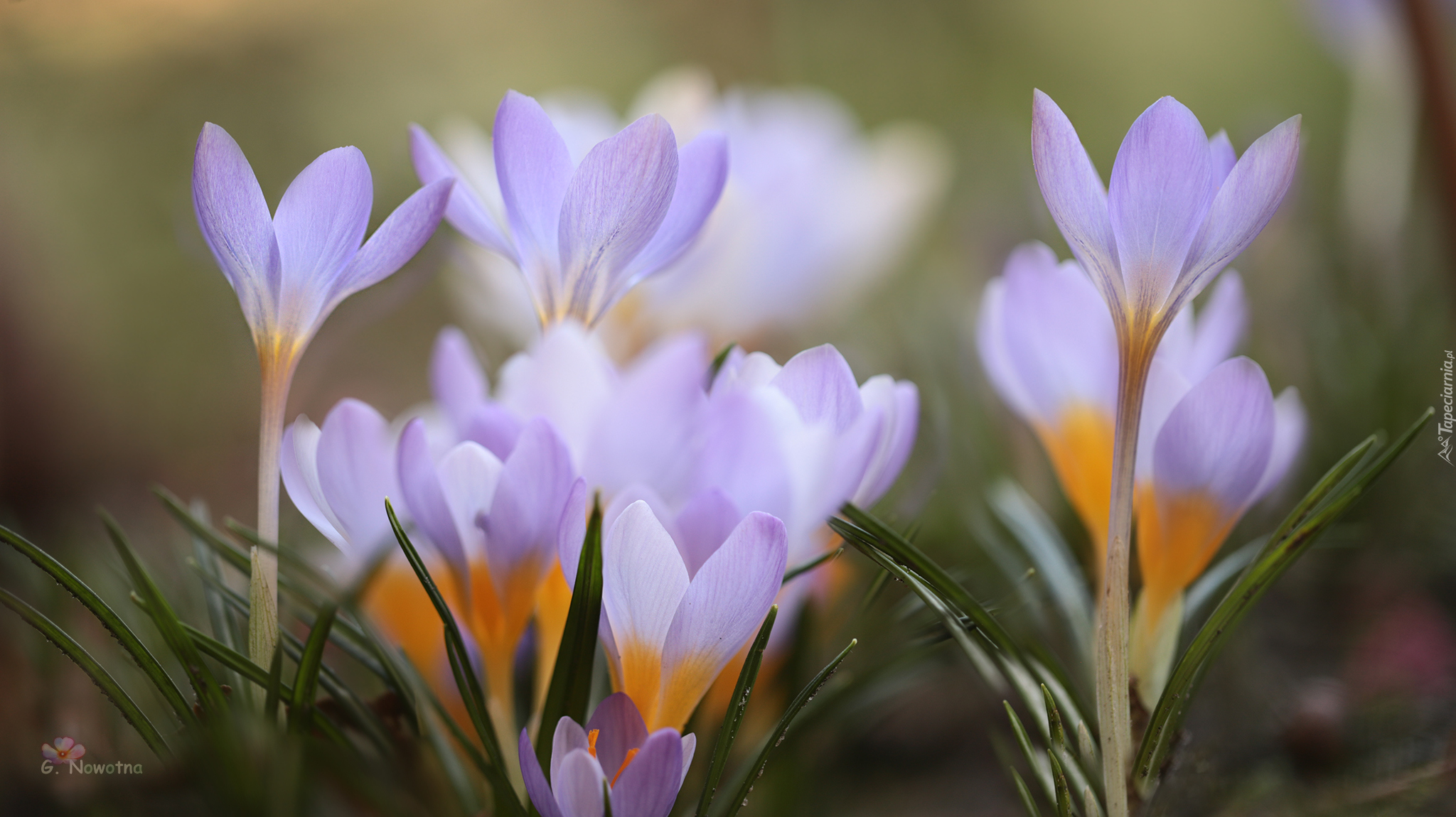 Edytor tapety: Rozświetlone światłem jasnofioletowe krokusy