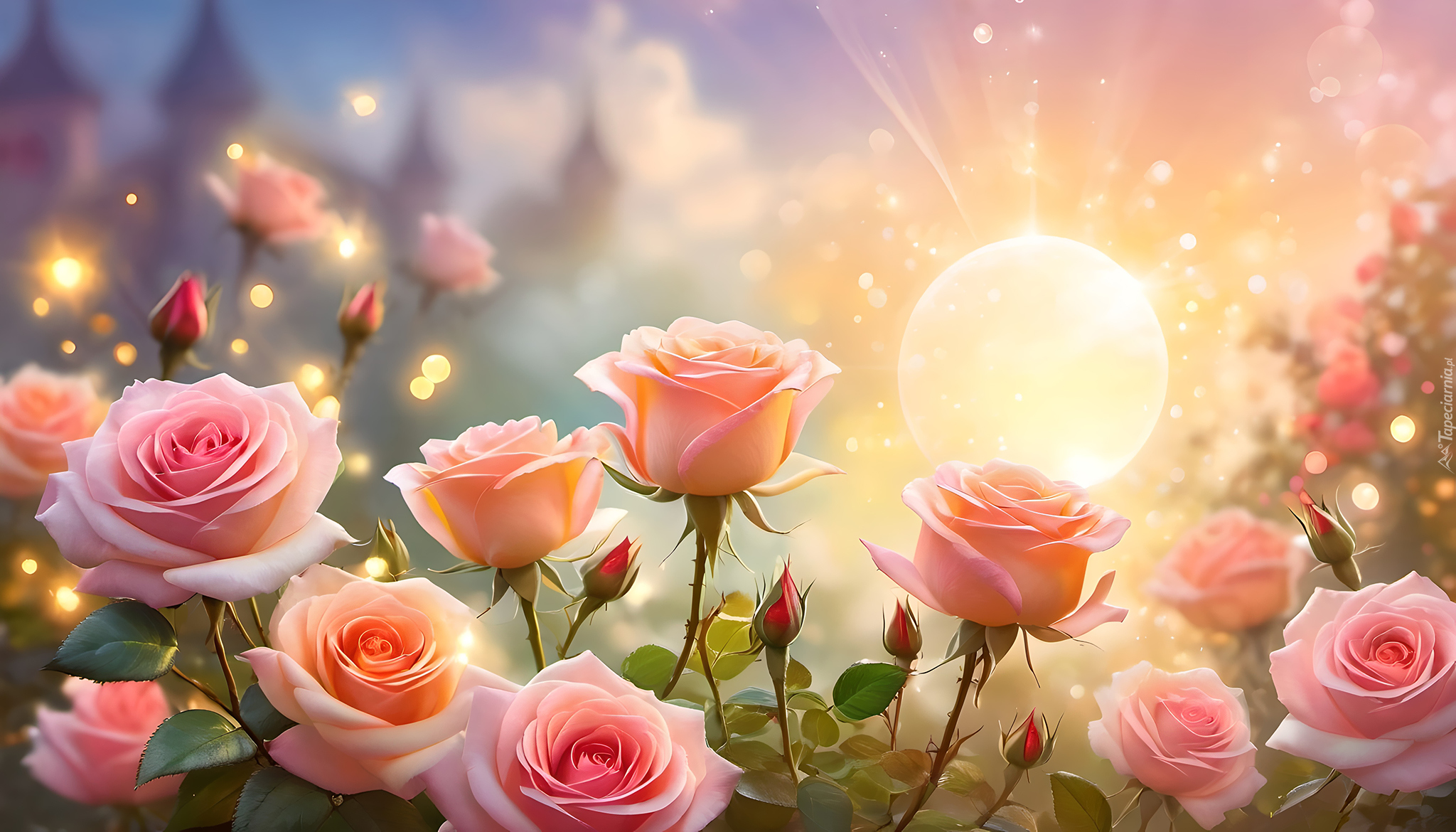 Edytor tapety: Rozświetlone promieniami słońca różowe róże z pąkami