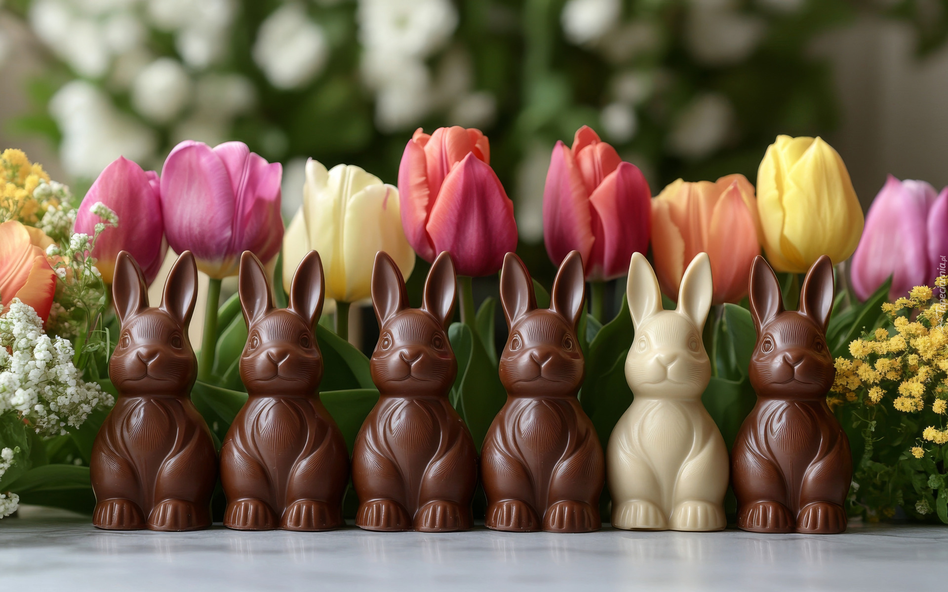 Edytor tapety: Czekoladowe króliki i kolorowe tulipany