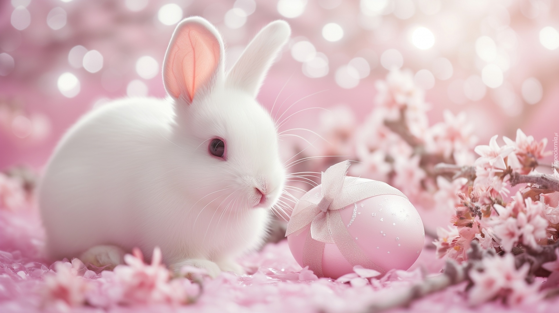 Edytor tapety: Biały królik i pisanka z kokardą obok kwiatów