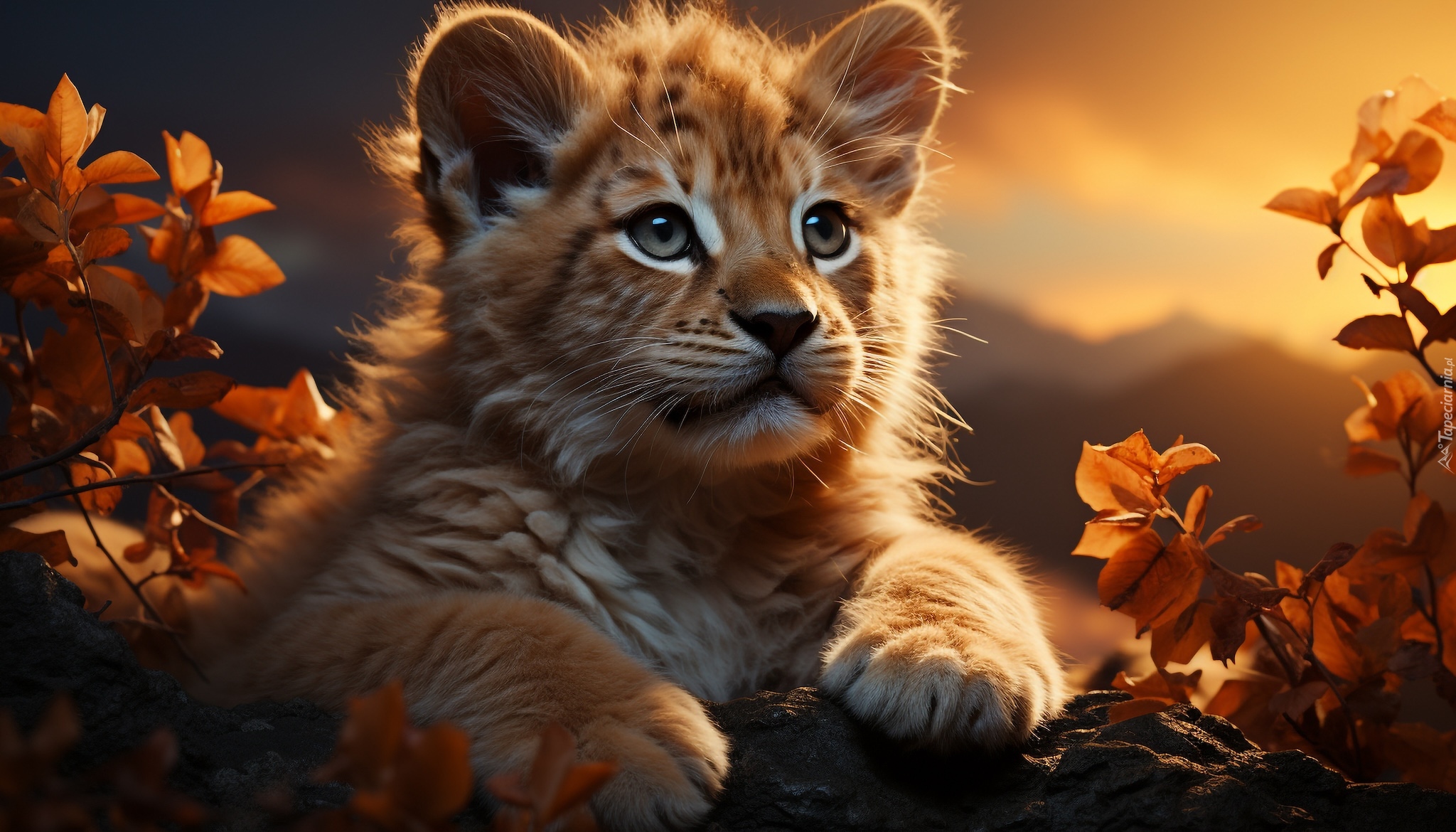 Edytor tapety: Leżący mały tygrys wśród roślin w blasku światła