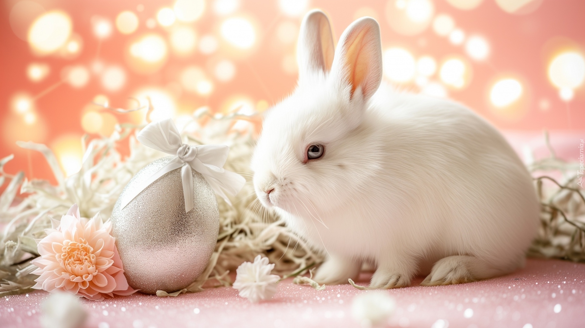 Edytor tapety: Biały królik i srebrna pisanka z kokardą