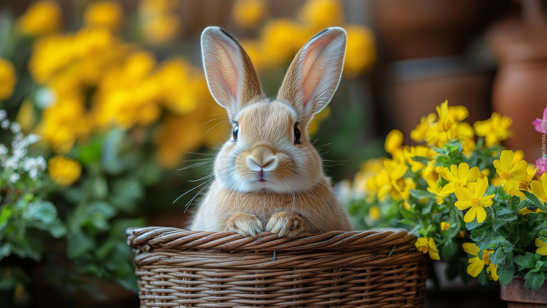 Edytor tapety: Królik w koszyku obok żółtych kwiatów