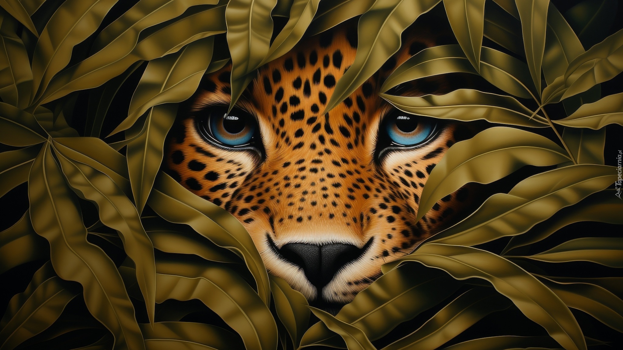 Edytor tapety: Głowa lamparta wśród liści w grafice