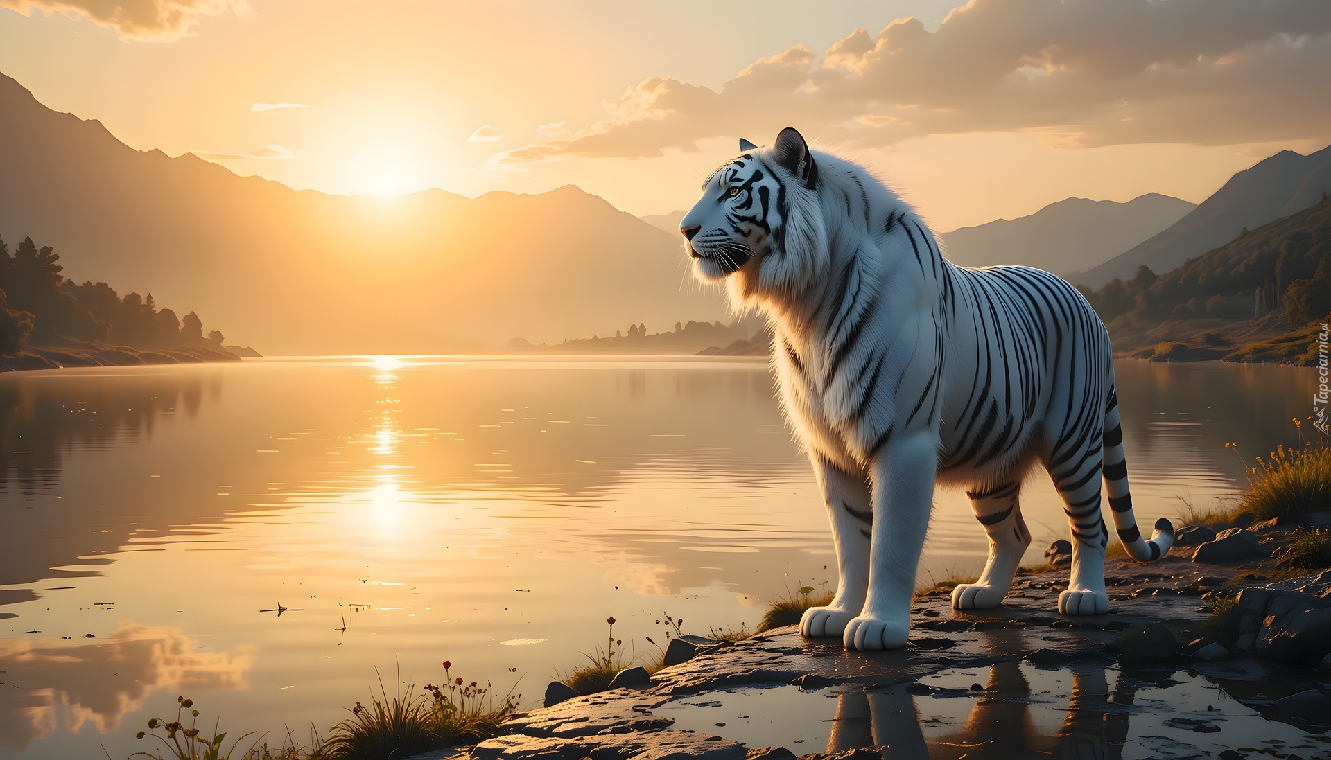Edytor tapety: Biały tygrys nad jeziorem w blasku zachodzącego słońca
