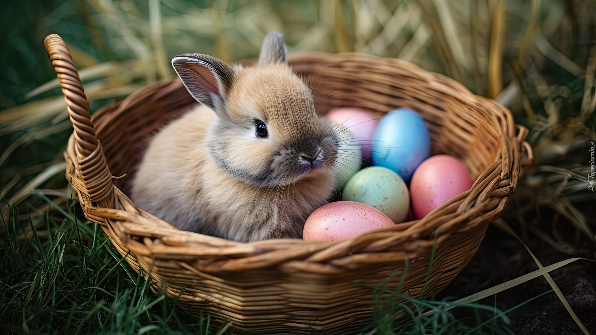 Edytor tapety: Koszyk z królikiem i pisankami na trawie