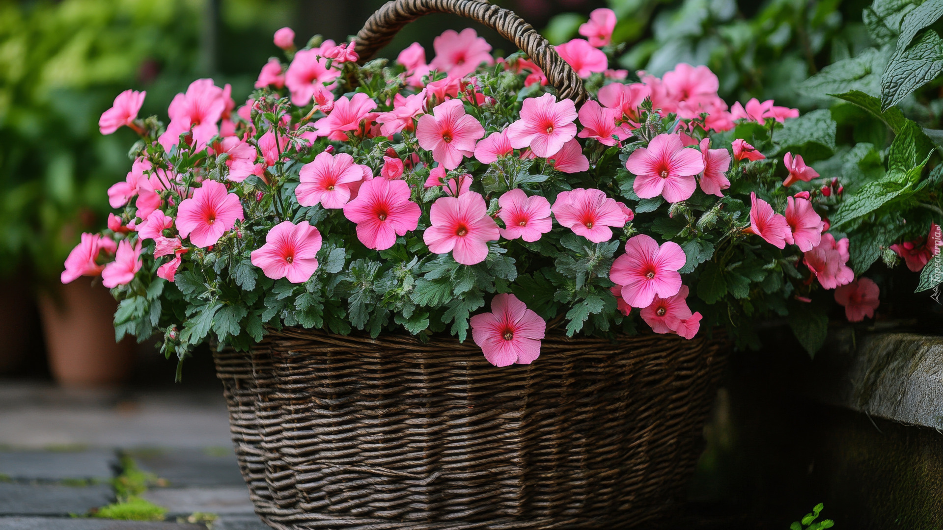 Edytor tapety: Różowe petunie w wiklinowym koszyku