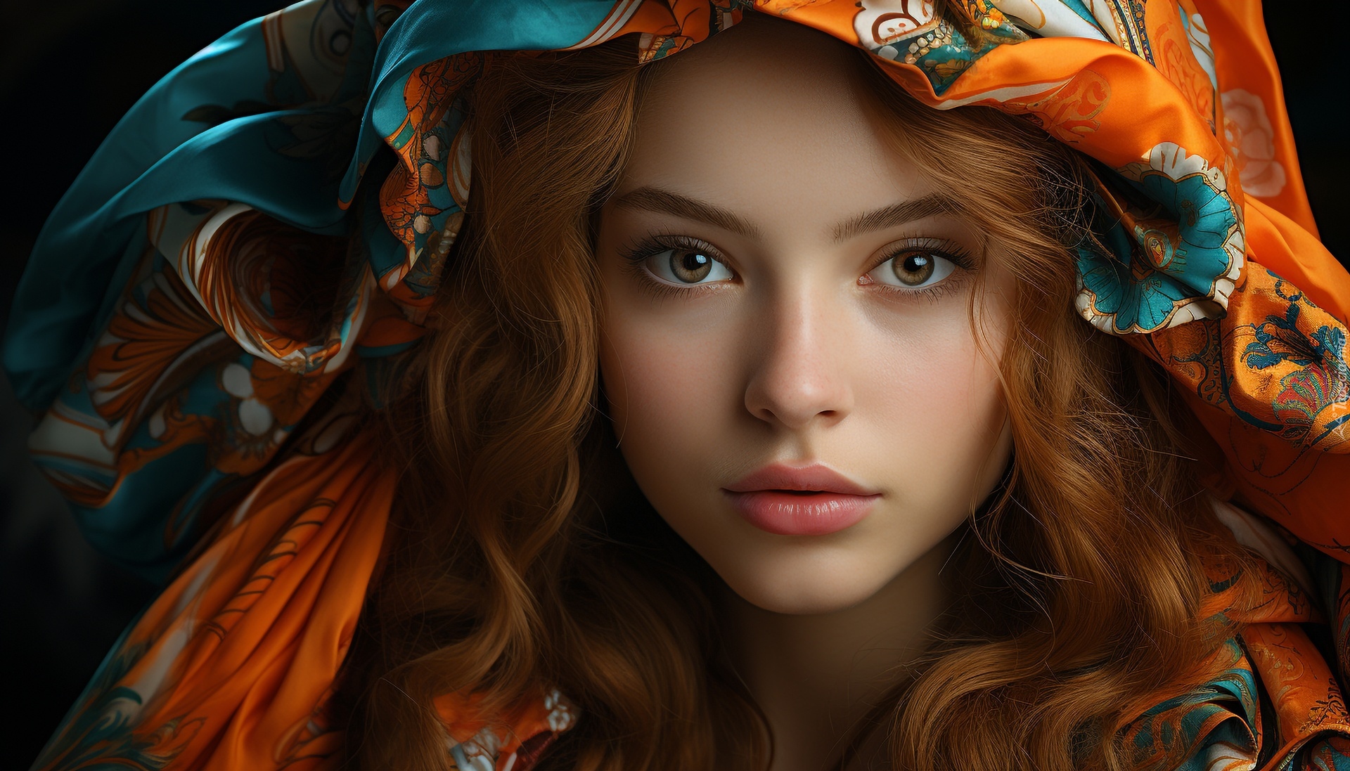 Edytor tapety: Rudowłosa kobieta w niebiesko-pomarańczowej chuście
