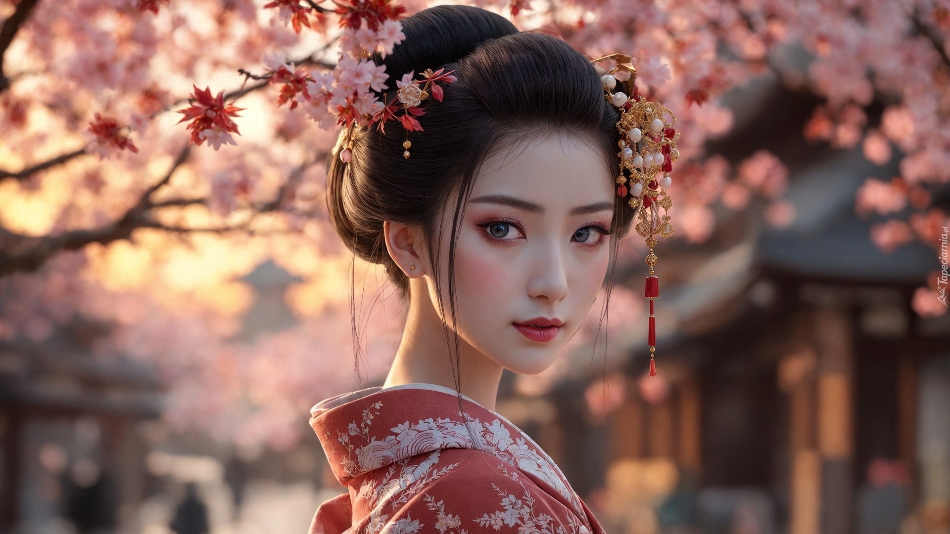 Edytor tapety: Japonka w kimono stojąca pod kwitnącym drzewem