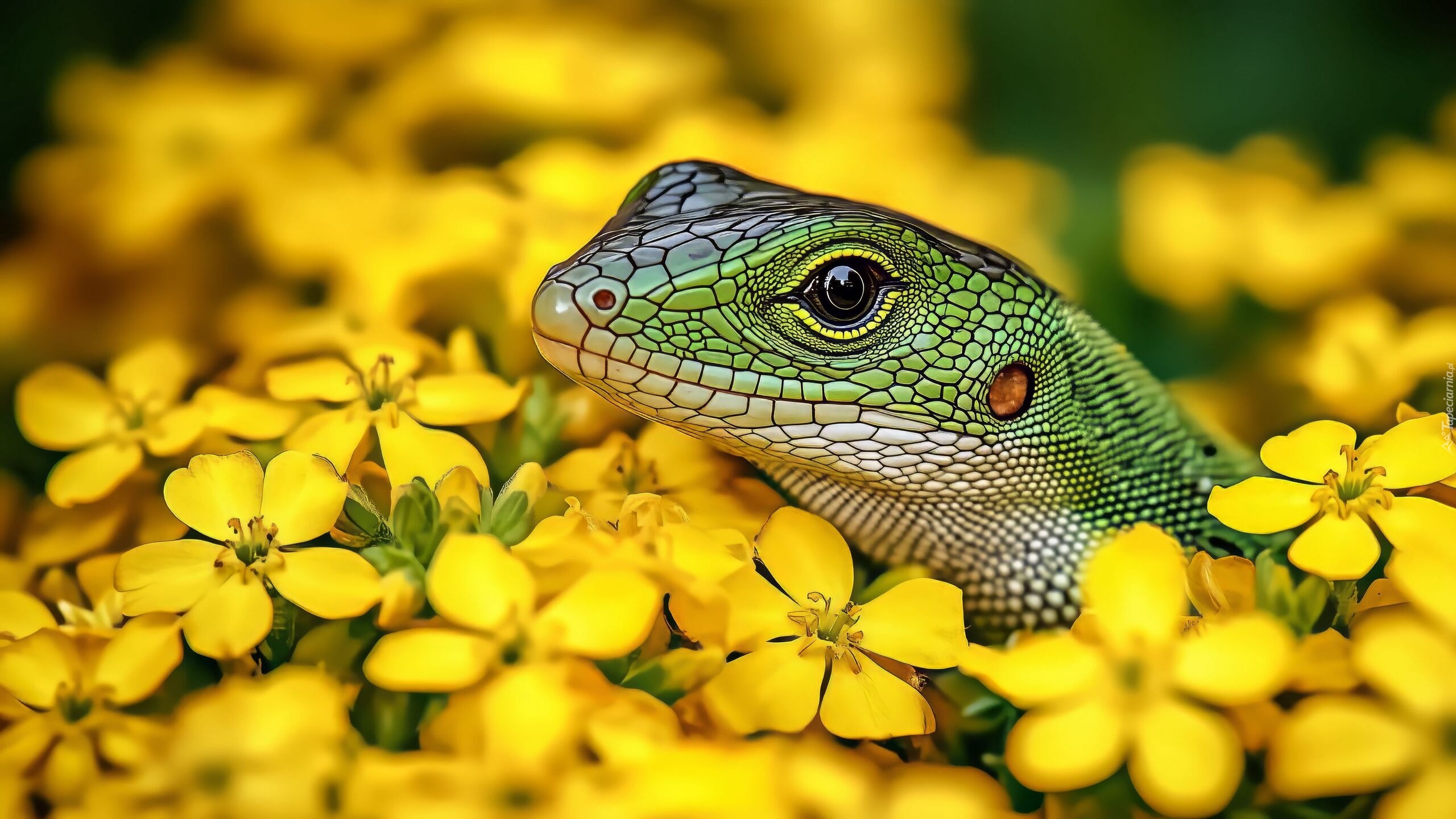 Edytor tapety: Jaszczurka w żółtych kwiatach