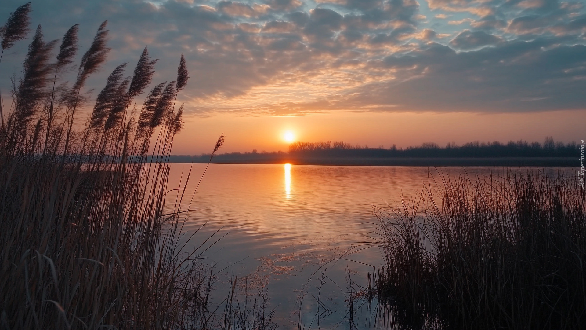 Edytor tapety: Szuwary i chmury nad jeziorem o zachodzie słońca