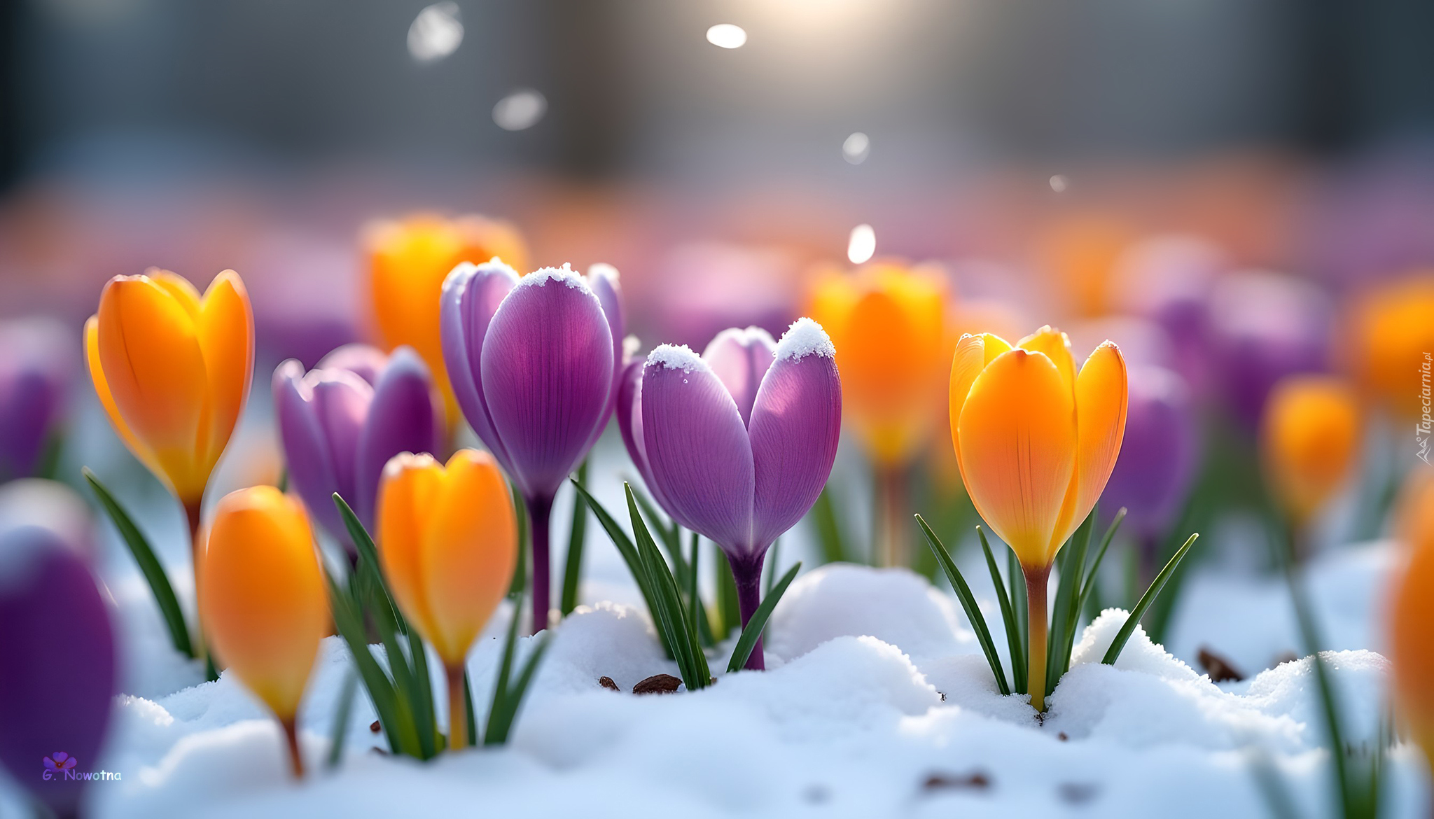Edytor tapety: Rozkwitające żółte i fioletowe krokusy w śniegu