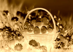 Edytor tapety: Koszyk z kolorowymi pisankami wśród kwiatów w słonecznym świetle