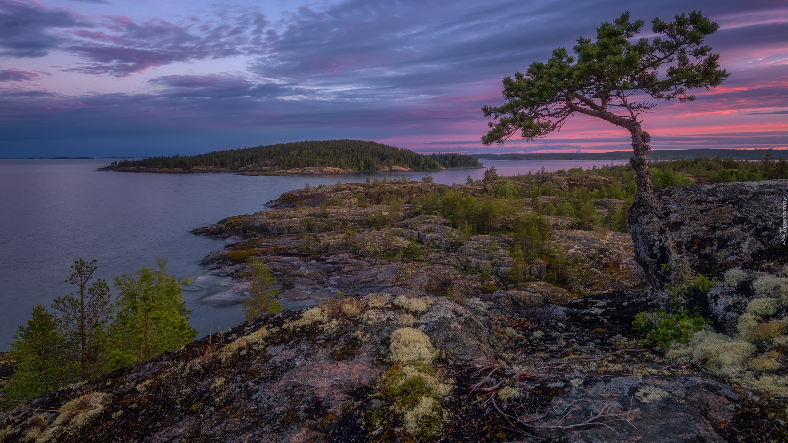 Edytor tapety: Drzewo na skałach i wysepka na jeziorze Ładoga