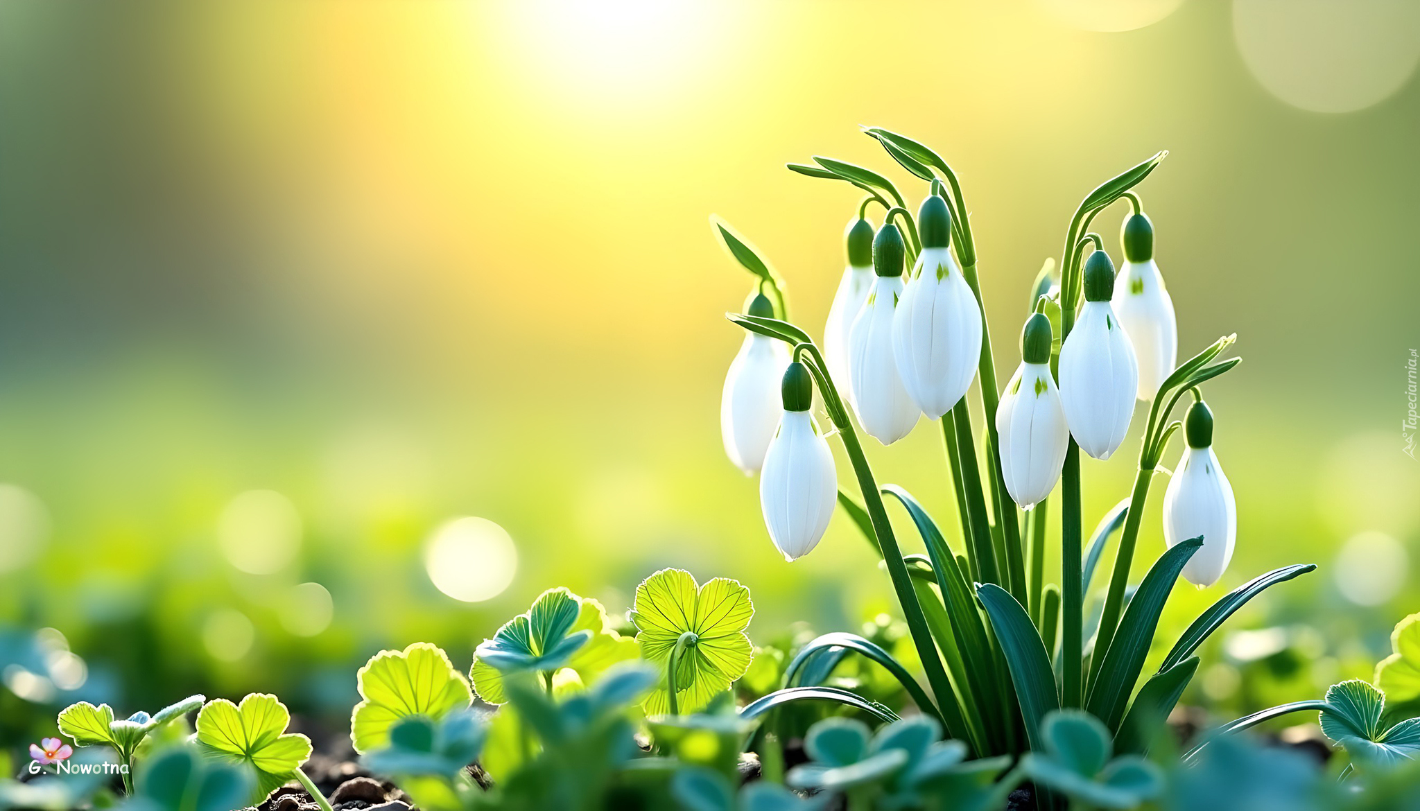 Edytor tapety: Kępka przebiśniegów wśród roślin na słonecznym tle