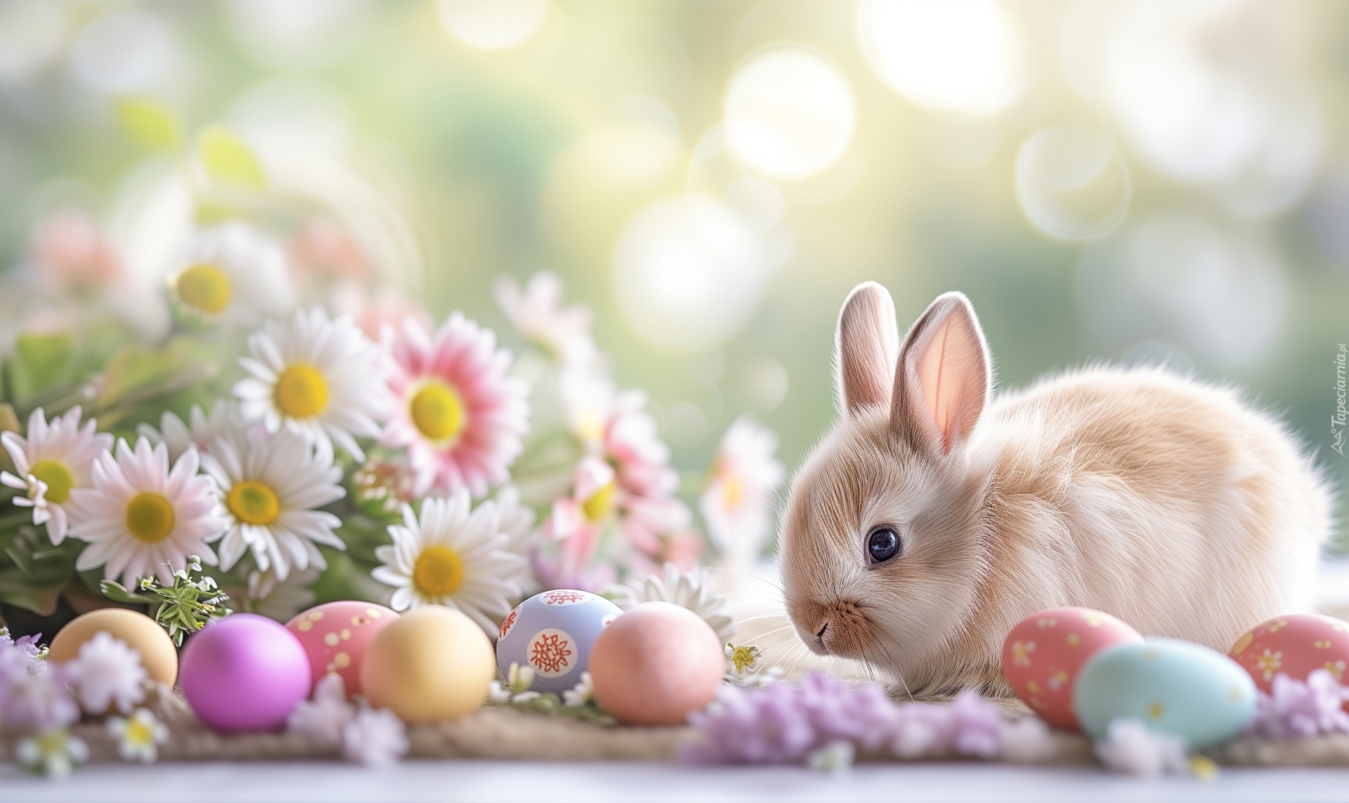 Edytor tapety: Królik obok kwiatów i pisanek