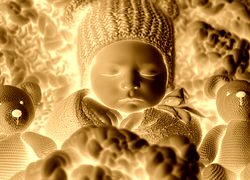 Edytor tapety: Śpiące niemowlę i dwa misie na kocu w niebieskiej tonacji
