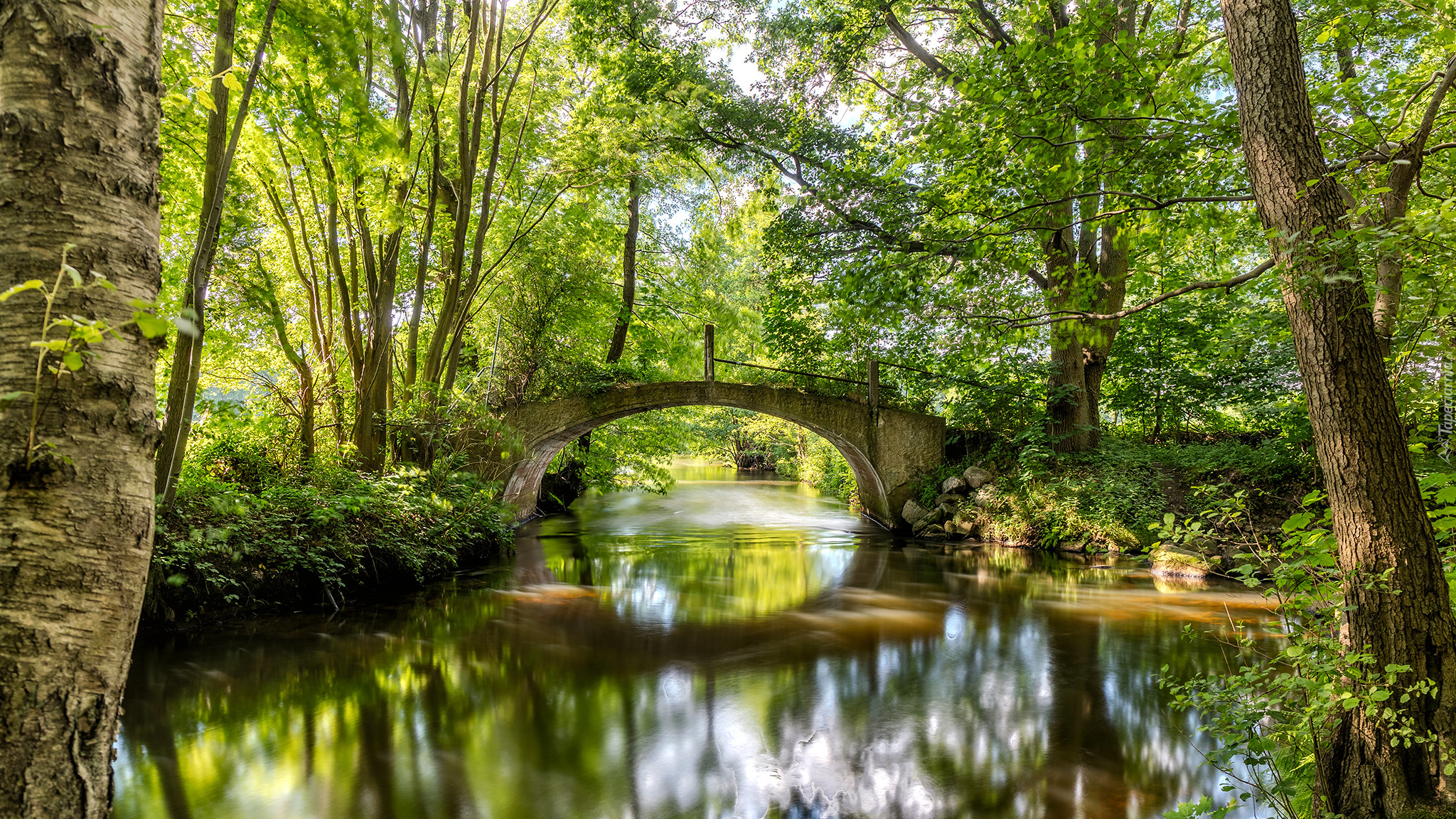 Edytor tapety: Zielone drzewa i kamienny most nad rzeką