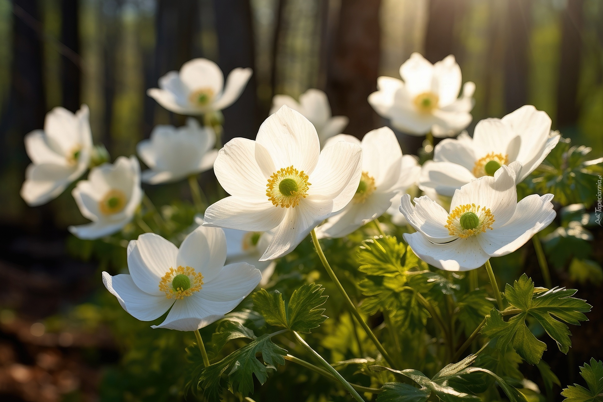 Edytor tapety: Rozświetlone białe zawilce z listkami