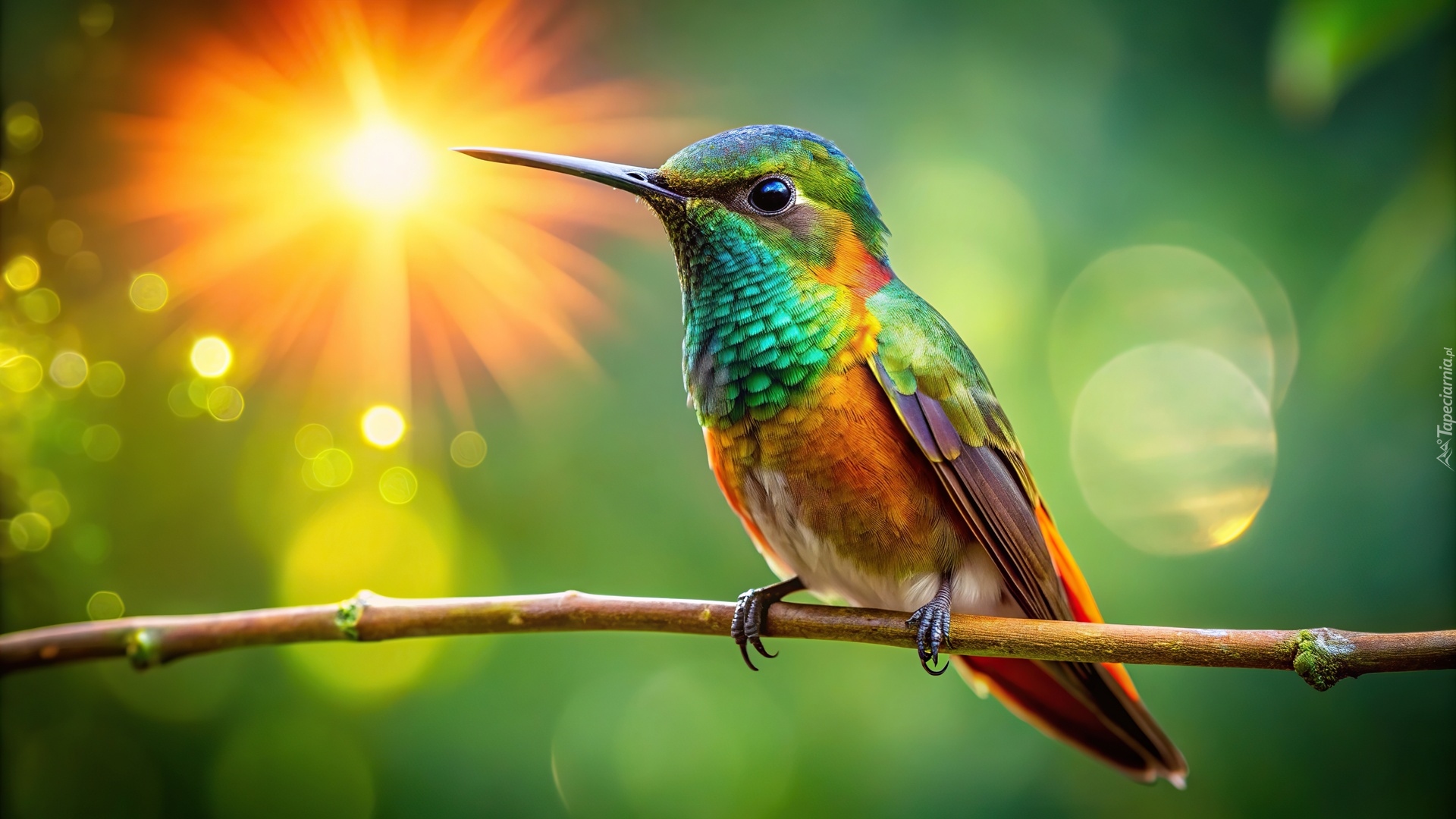 Edytor tapety: Koliber na gałązce w blasku słońca