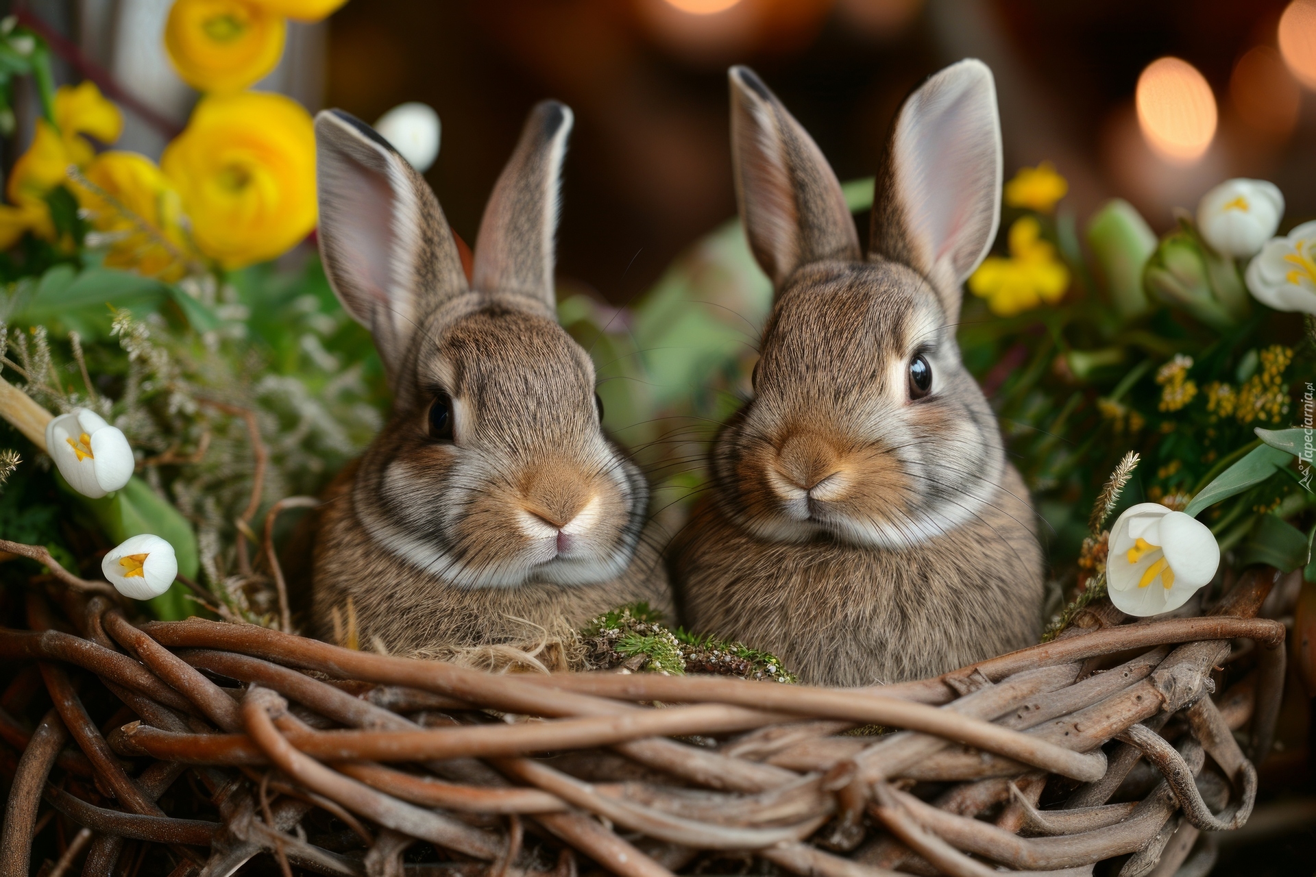 Edytor tapety: Kwiaty obok dwóch królików w gniazdku