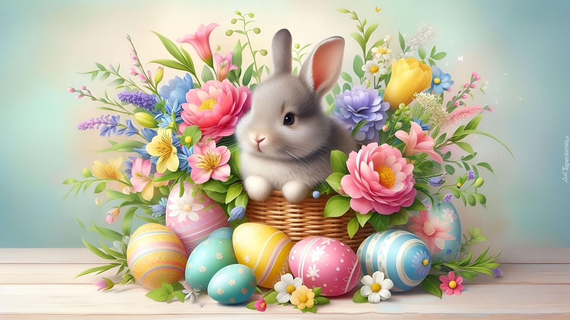 Edytor tapety: Królik w koszyku obok kolorowych pisanek i kwiatów