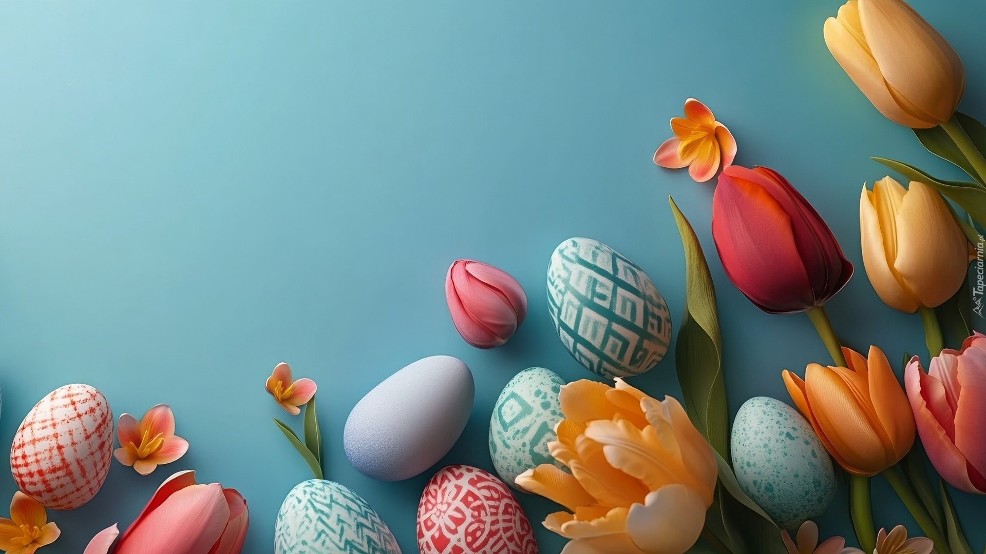 Edytor tapety: Pisanki i kolorowe tulipany na niebieskim tle