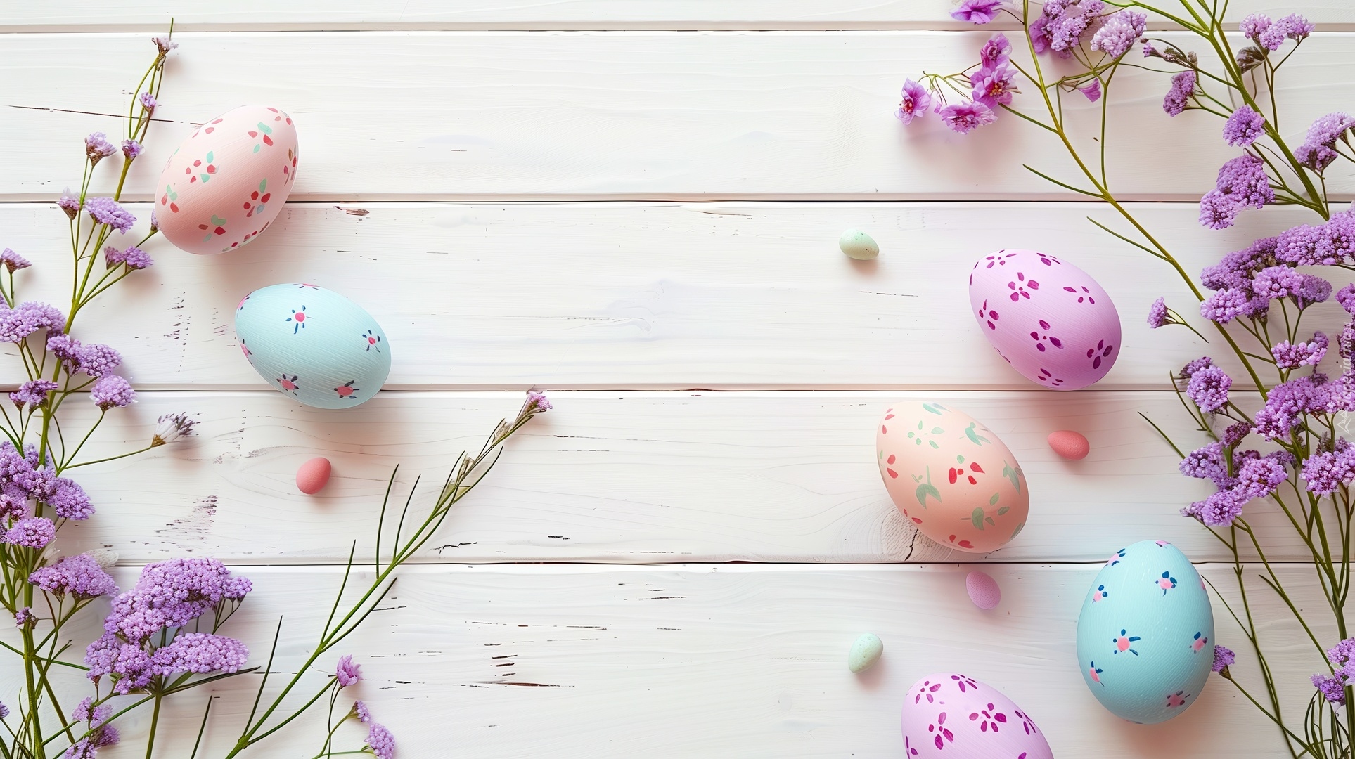 Edytor tapety: Kolorowe pisanki i fioletowe kwiaty na jasnych deskach