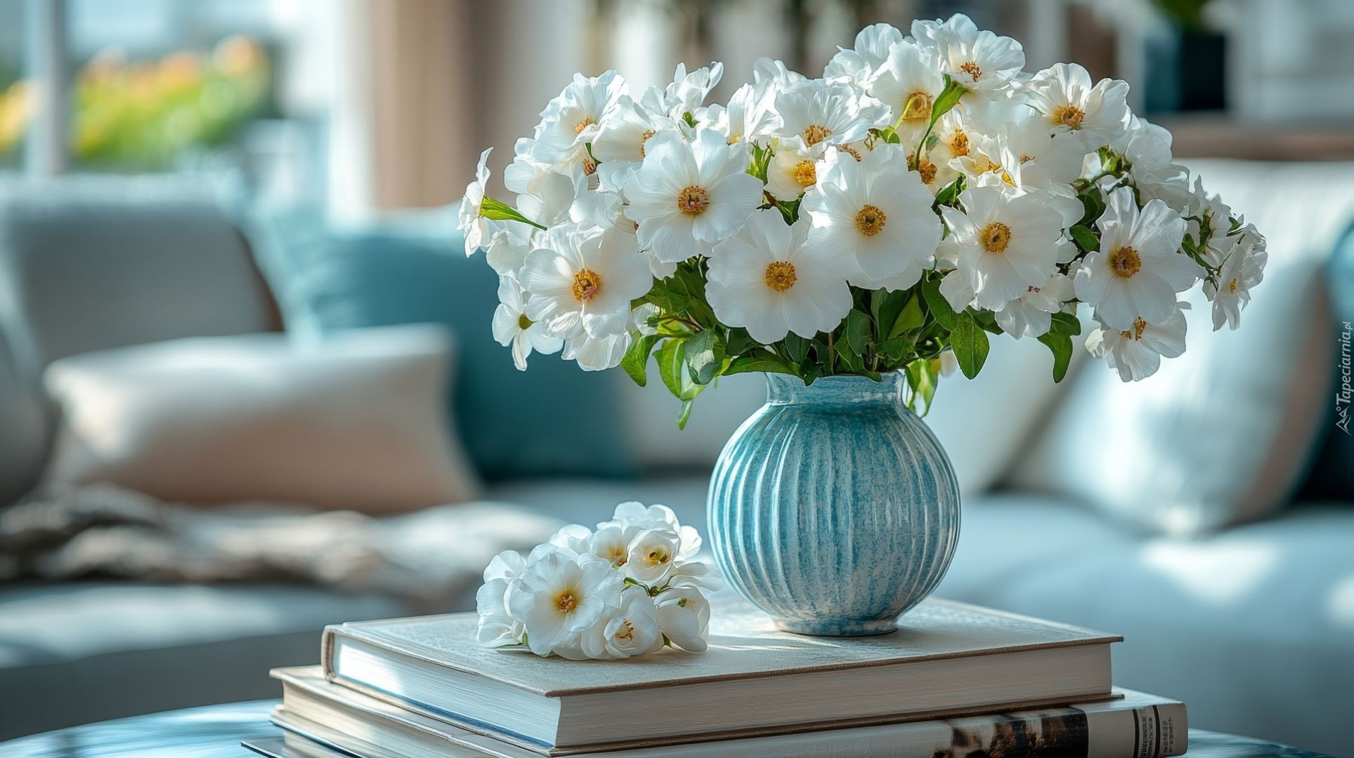 Edytor tapety: Białe zawilce w wazonie i na książkach