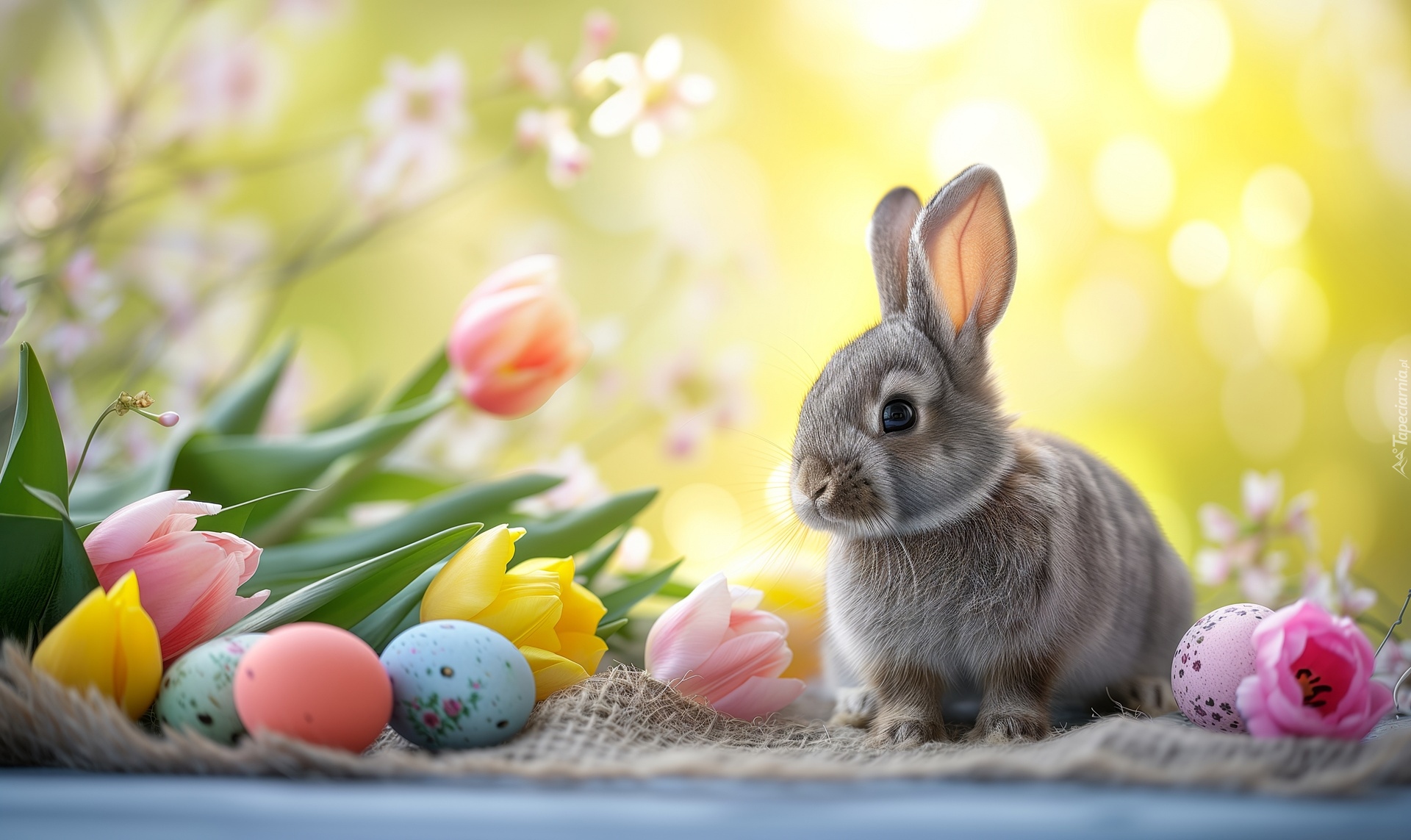 Edytor tapety: Królik obok pisanek i tulipanów na rozmytym tle