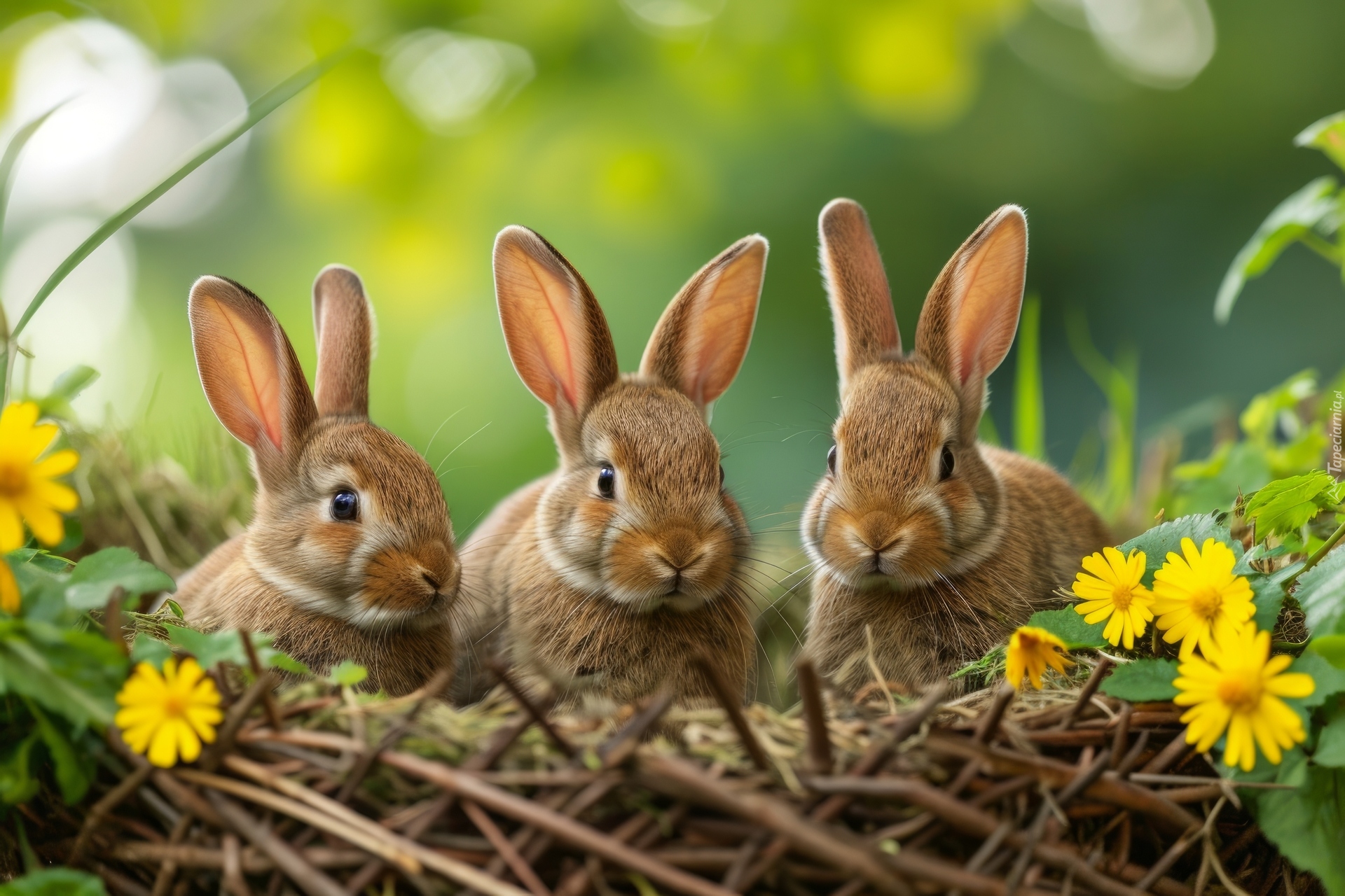 Edytor tapety: Trzy króliki w gniazdku obok żółtych kwiatów