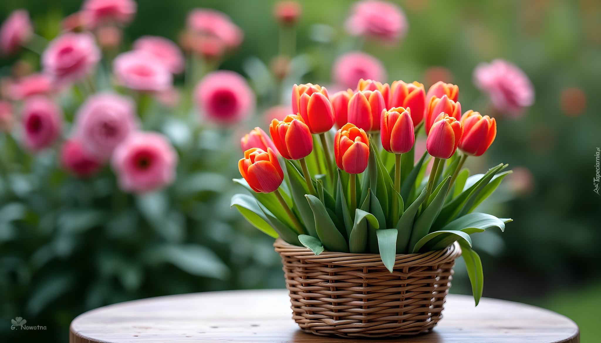 Edytor tapety: Czerwone tulipany w koszyku na stole