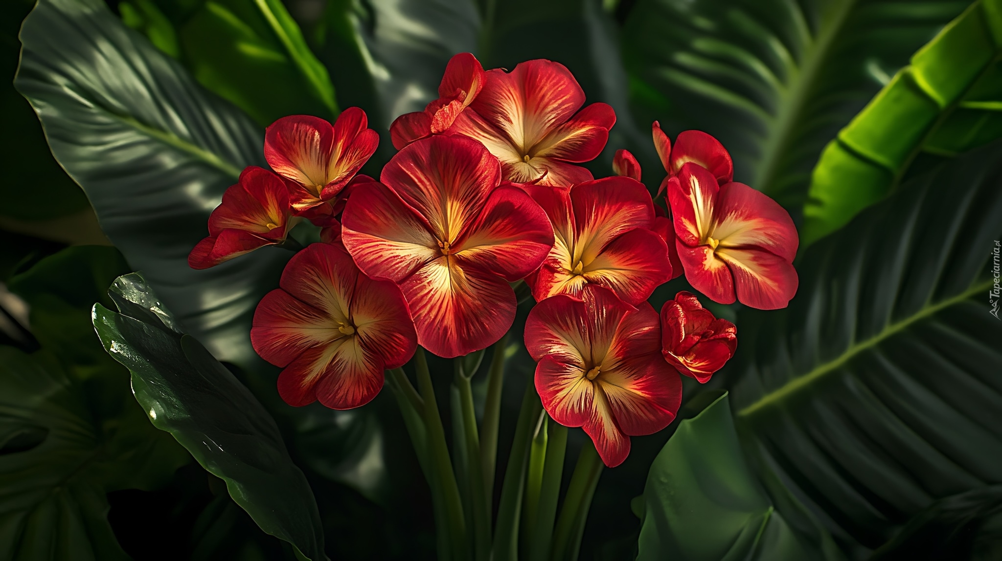 Edytor tapety: Czerwone kwiaty i zielone liście w grafice