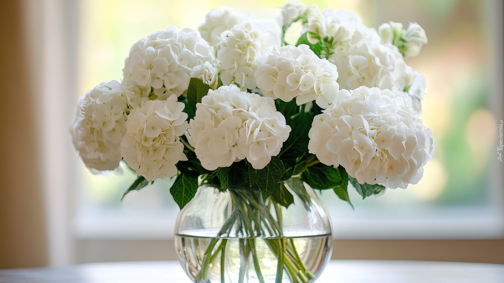 Edytor tapety: Białe hortensje w szklanym wazonie