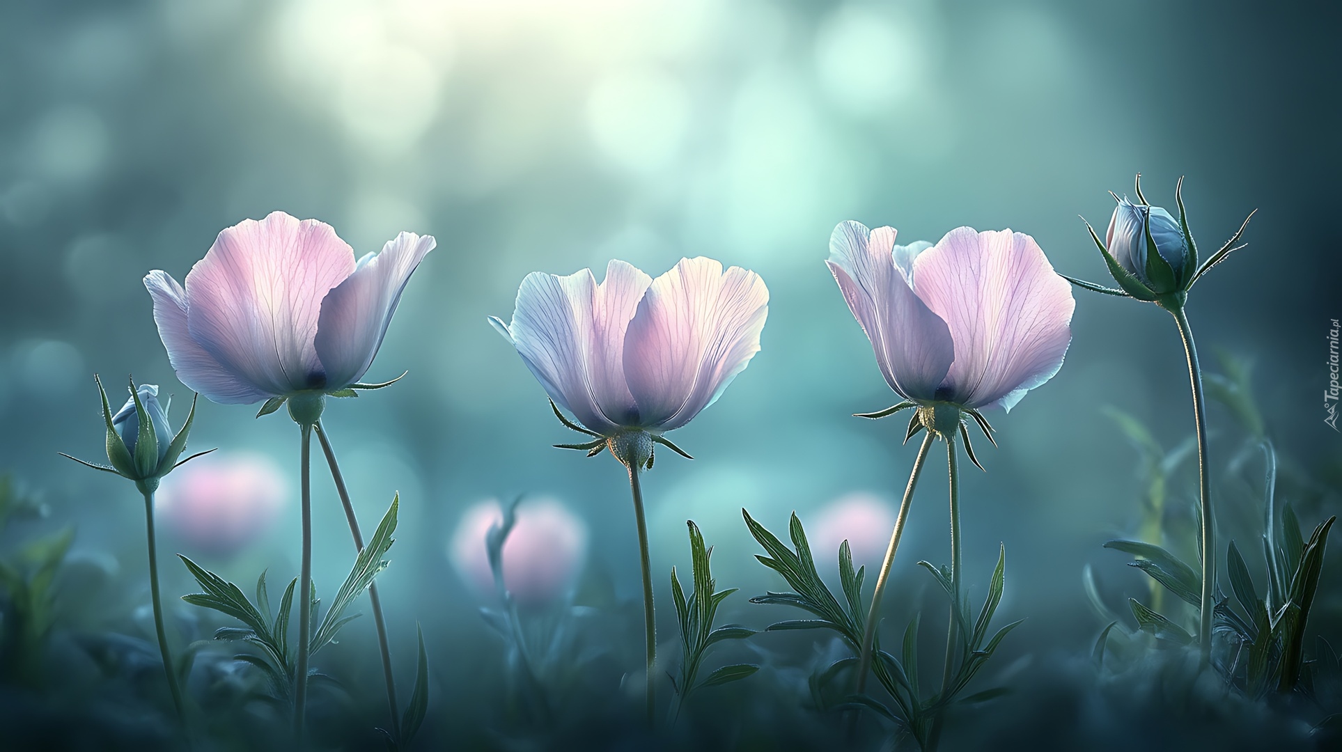 Edytor tapety: Trzy kwiaty i dwa pąki na rozmytym tle