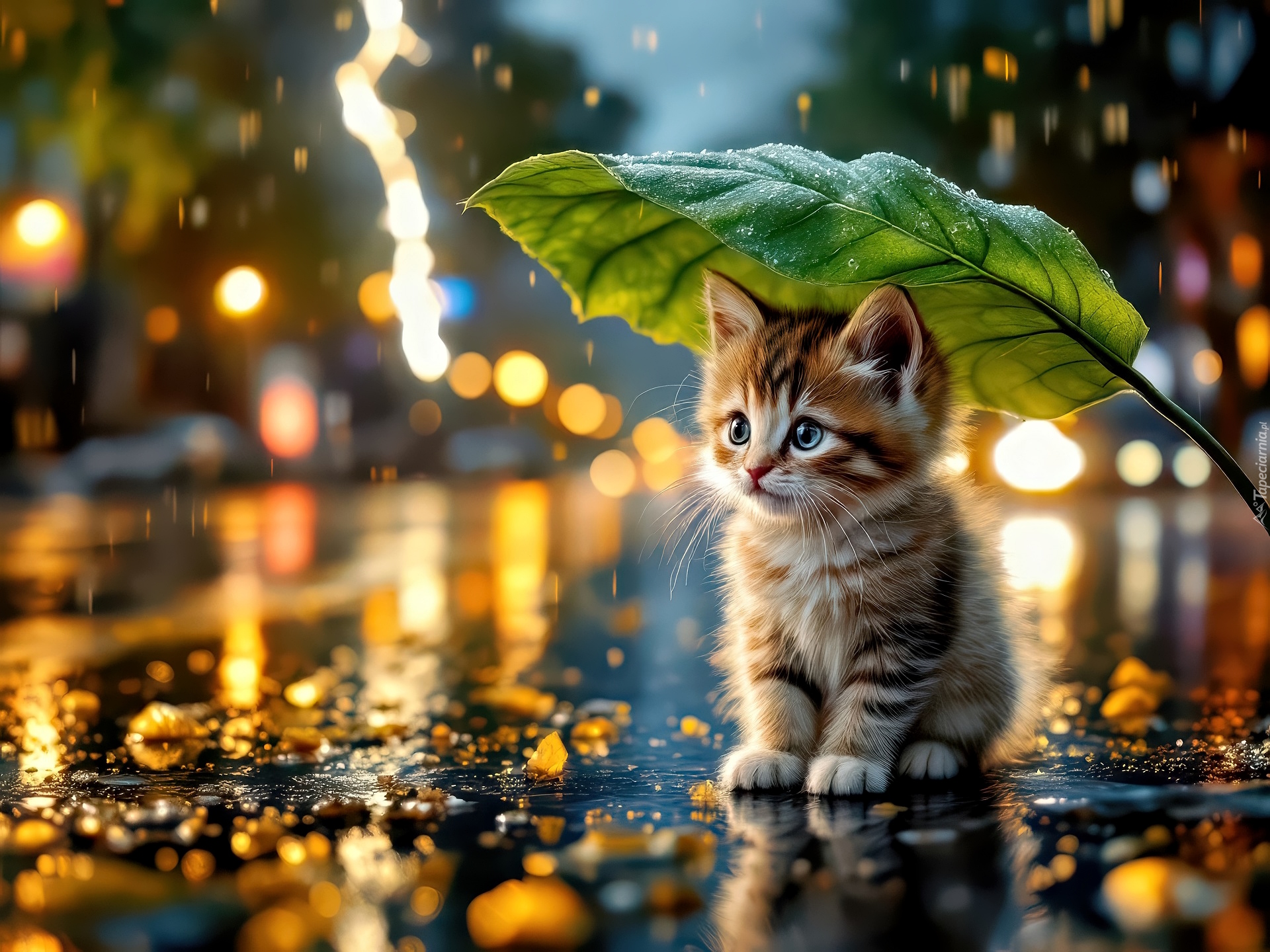 Edytor tapety: Kot na mokrej ulicy pod liściem