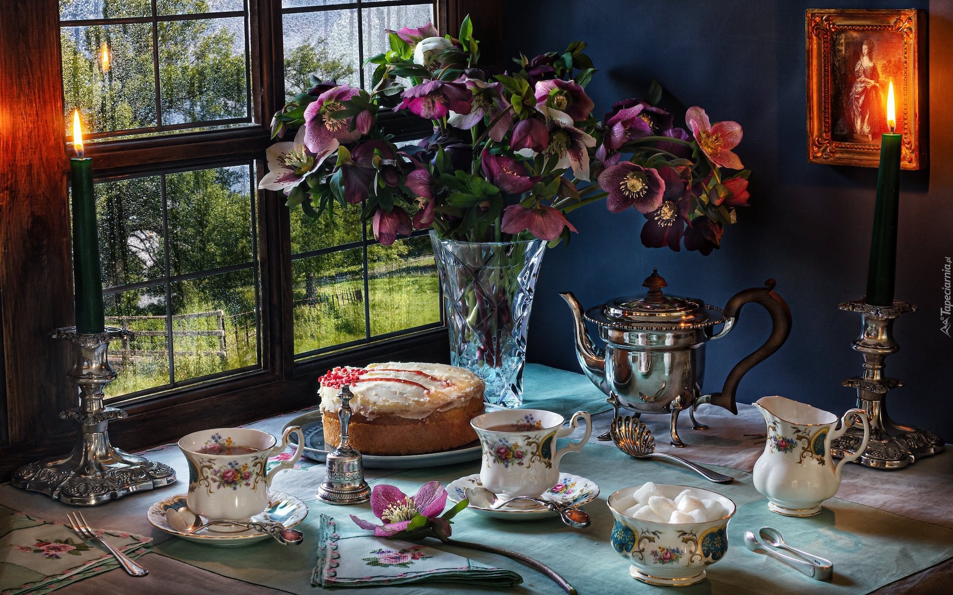 Edytor tapety: Bukiet kwiatów przy oknie obok świec i ciasta