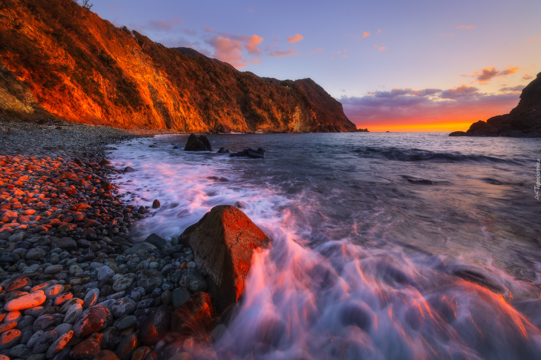 Edytor tapety: Rozświetlone zachodzącym słońcem skały na wybrzeżu morza