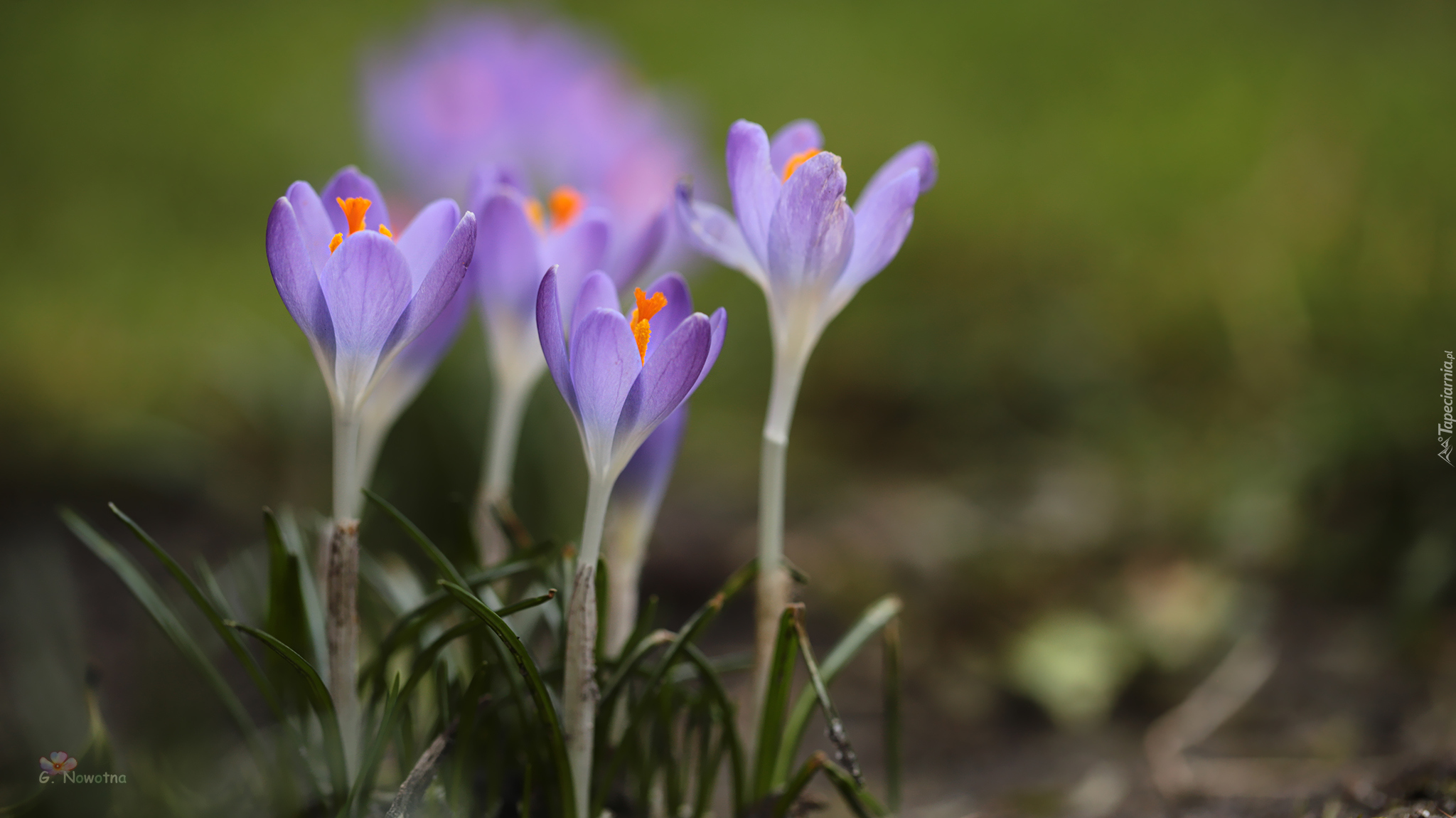 Edytor tapety: Kępka rozkwitających fioletowych krokusów na rozmytym tle