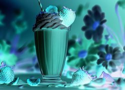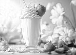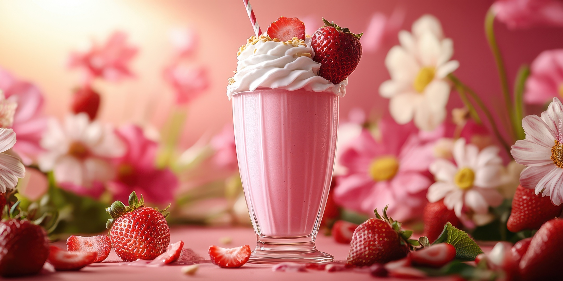 Edytor tapety: Koktajl z bitą śmietaną i truskawkami obok kwiatów